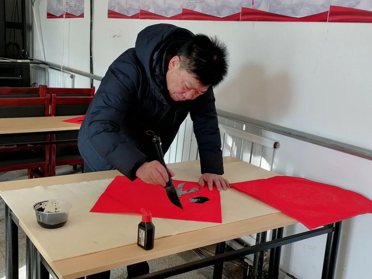 一支支毛笔饱蘸深情,于红纸间流转腾挪,将温暖真挚的新春祝愿化作缕缕墨香,为冬日乡村增添了浓厚的文化年味与盎然春意。