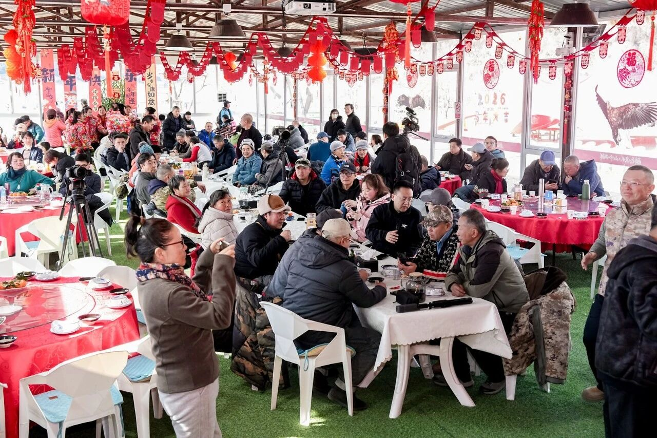 同时,湖畔耕读园负责人隗合亮也同步发布针对于观鸟爱好者们的“五免政策”,为更多爱好者们提供更加舒适、便捷的拍摄服务与场地。讨论结束后,大家齐聚一堂,共享“千人英雄宴”。席间笑语不断,情谊融融。这场兼具专业性与温度的聚会,不仅促进了摄影爱好者之间的深度交流,更通过面对面沟通,推动了生态保护与公共服务的具体举措落地。