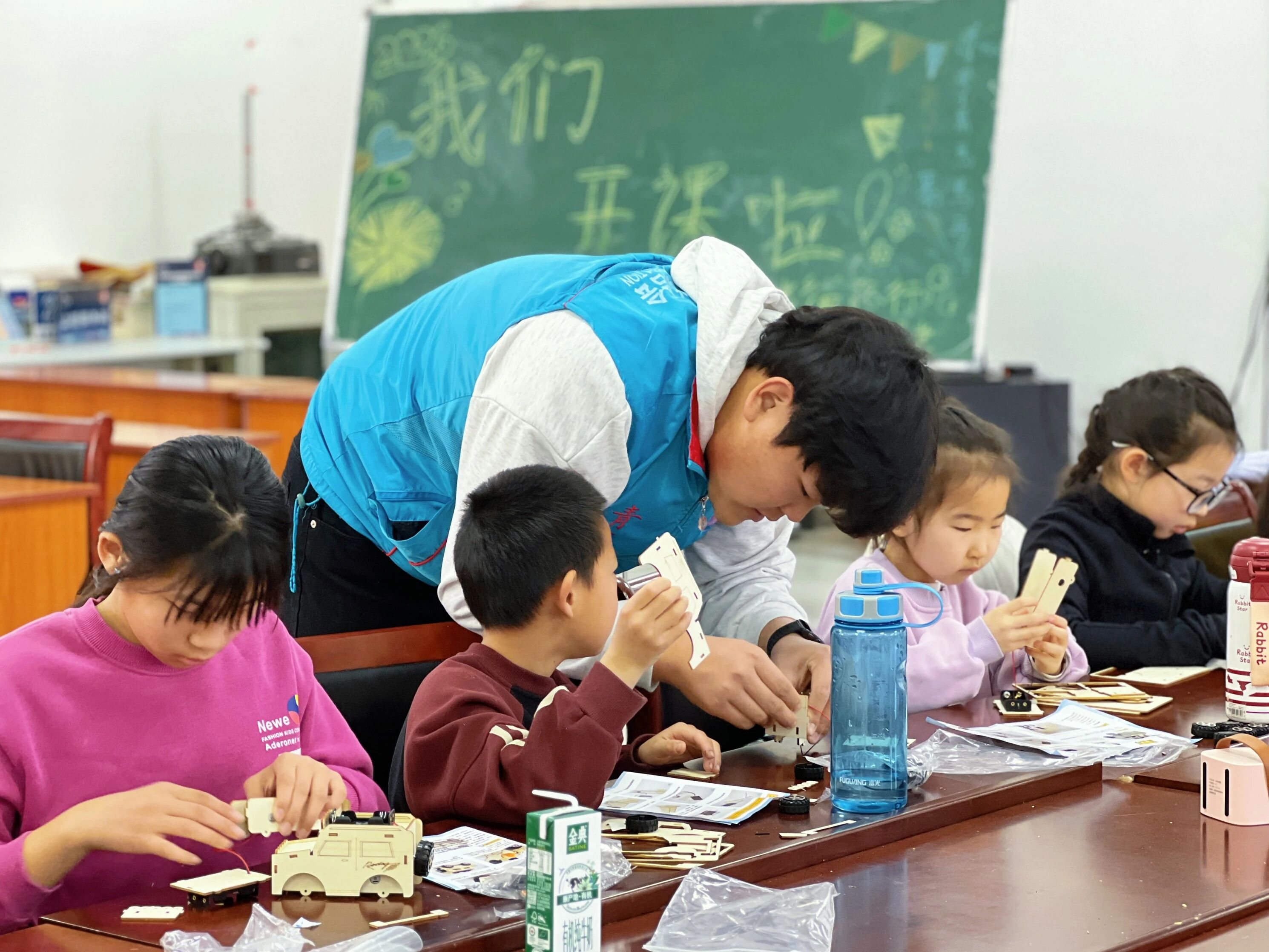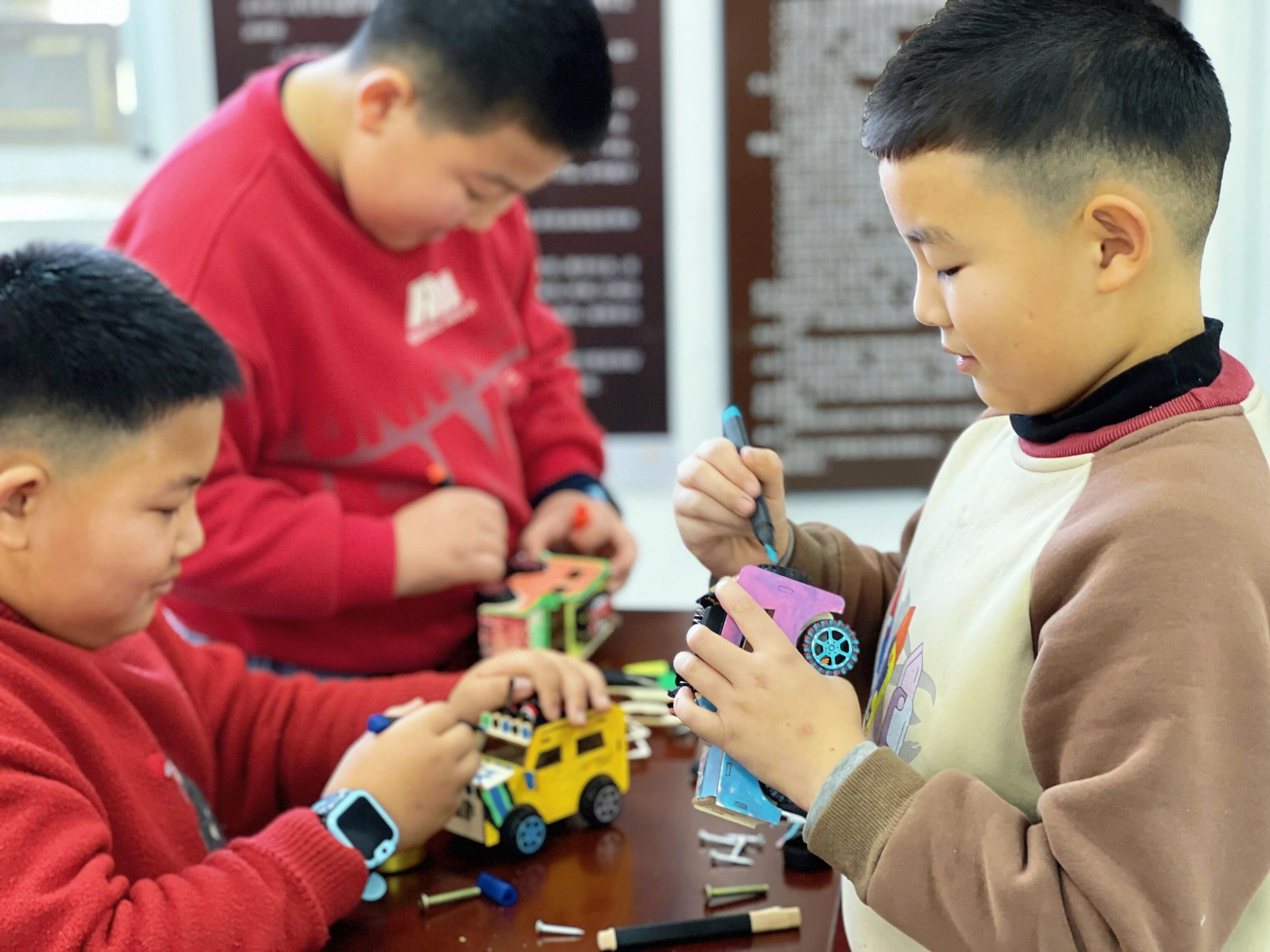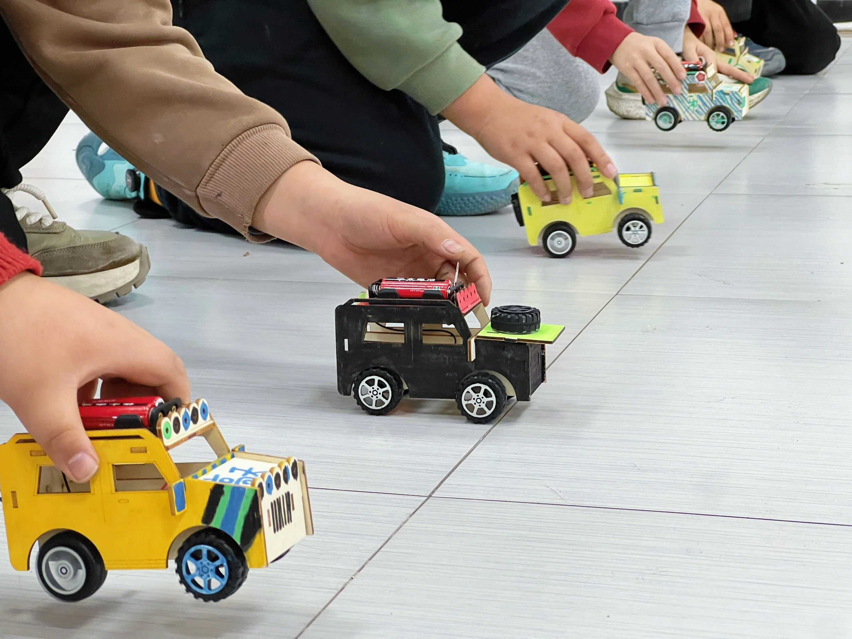 当亲手组装的动力小汽车成功启动、向前行驶时,教室里响起阵阵欢呼声。孩子们看着自己的作品满是自豪与喜悦,还纷纷为小车DIY专属车衣,让每一辆小车都独一无二,在创造中收获满满的成就感。