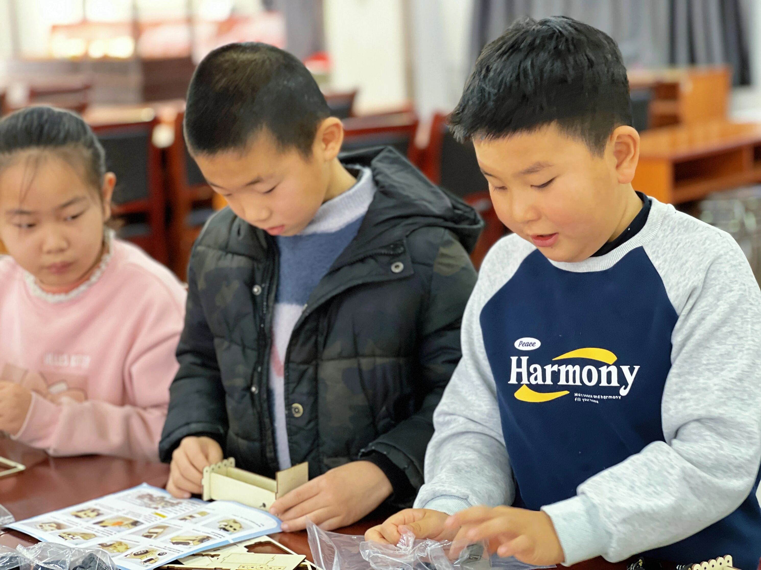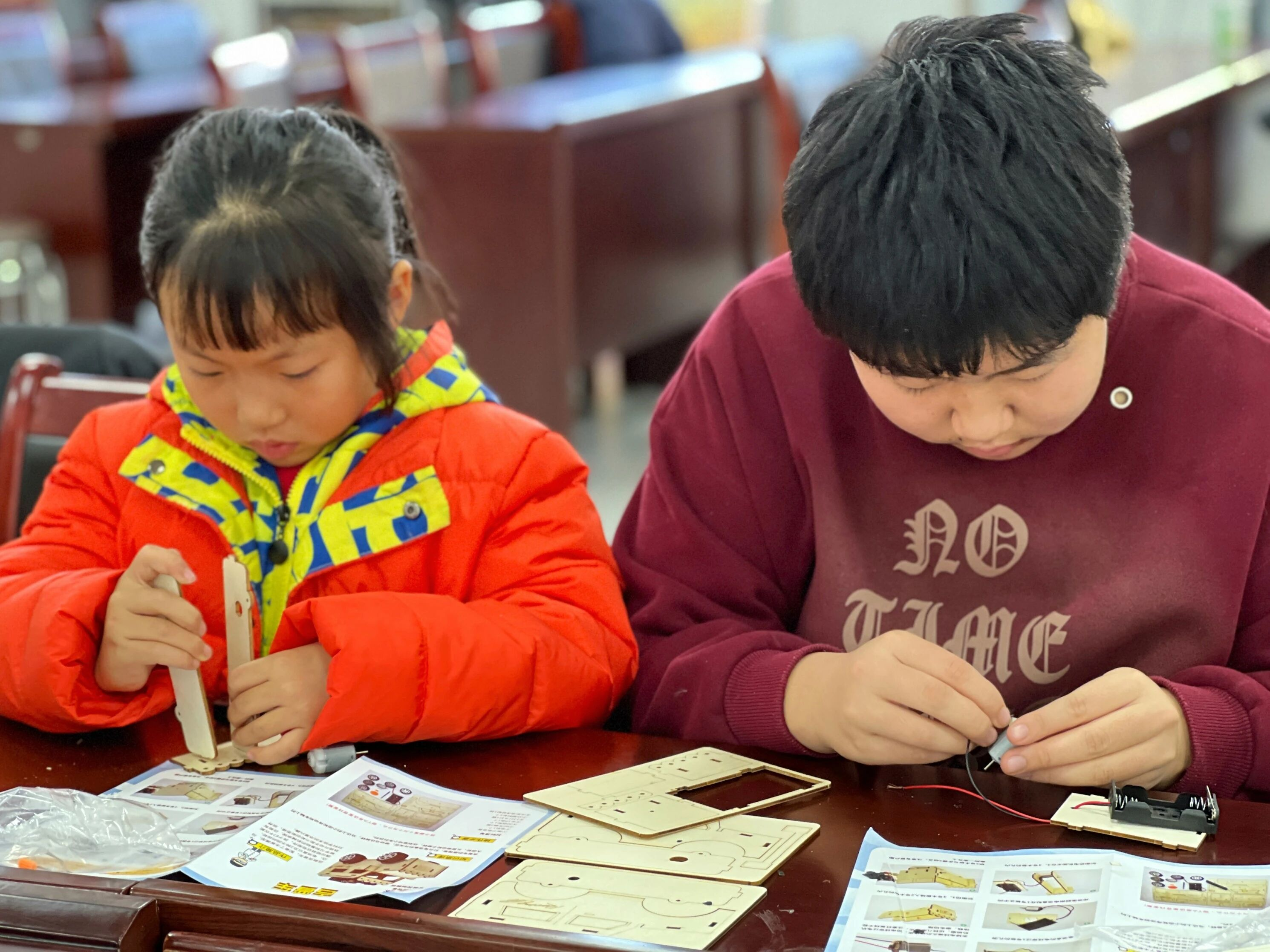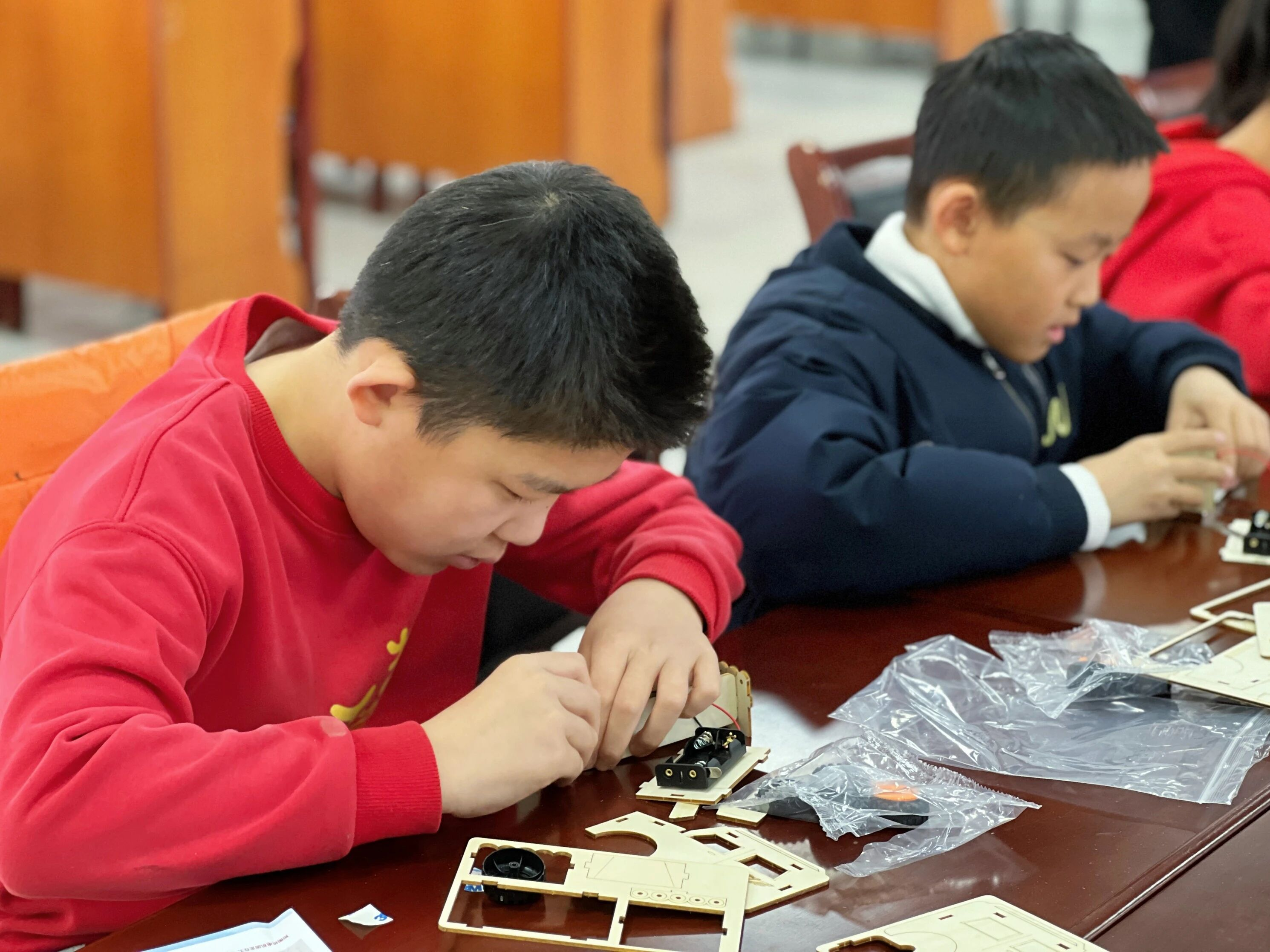 科普环节结束后,孩子们期待的组装实践正式开启。面对散落的零件,大家对照步骤图认真操作,拧螺丝、装电机、接线路、固定车轮,每一步都小心翼翼、全神贯注。过程中,孩子们或独立思考、耐心尝试,或互帮互助、合作探究,遇到难题主动向老师请教,在不断摸索中修正调整,在协作中感受实践的乐趣。