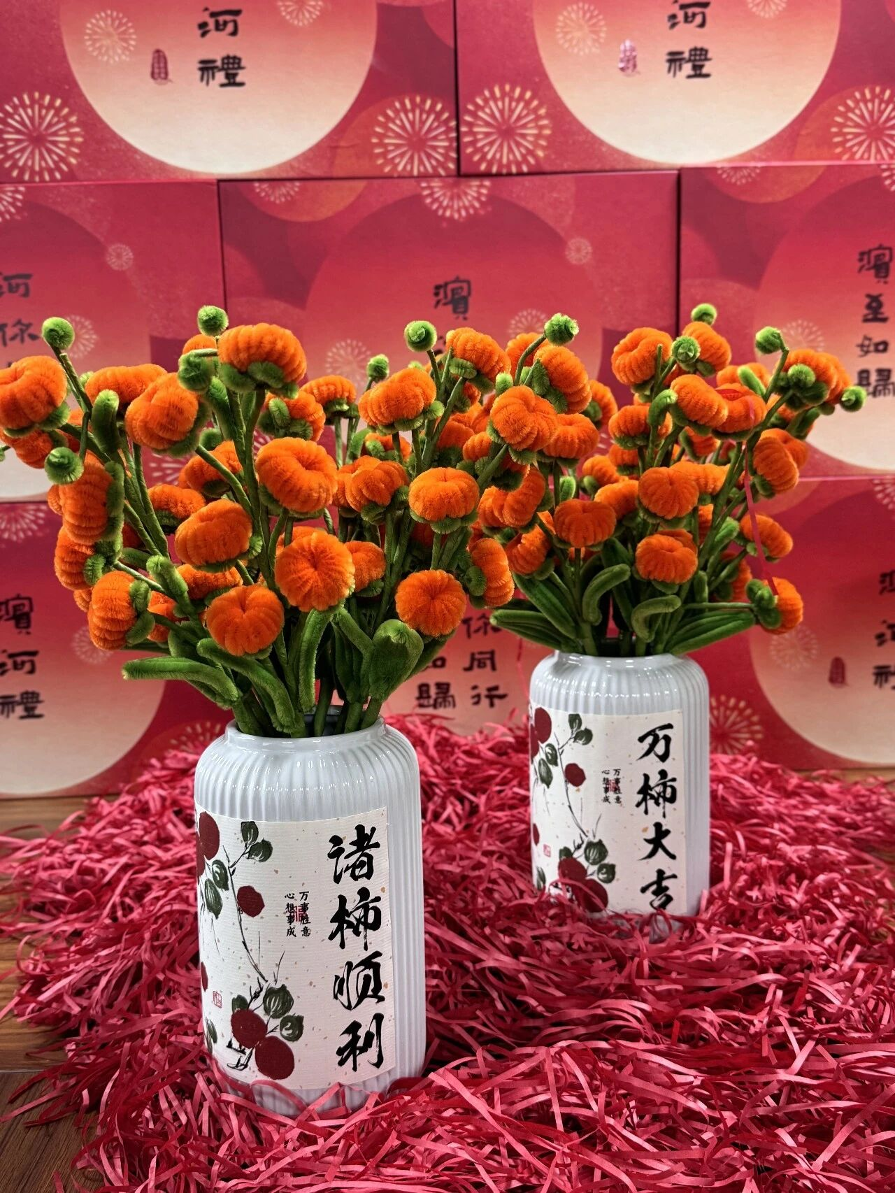 扭扭棒编就的橙红柿子,饱满得仿佛能挤出甜汁,藏着 “柿柿如意”“好柿多多” 的朴实祝愿;