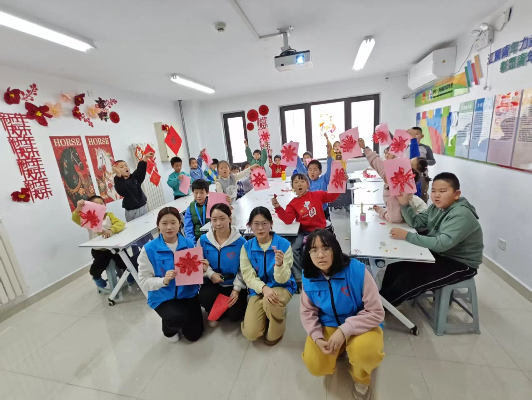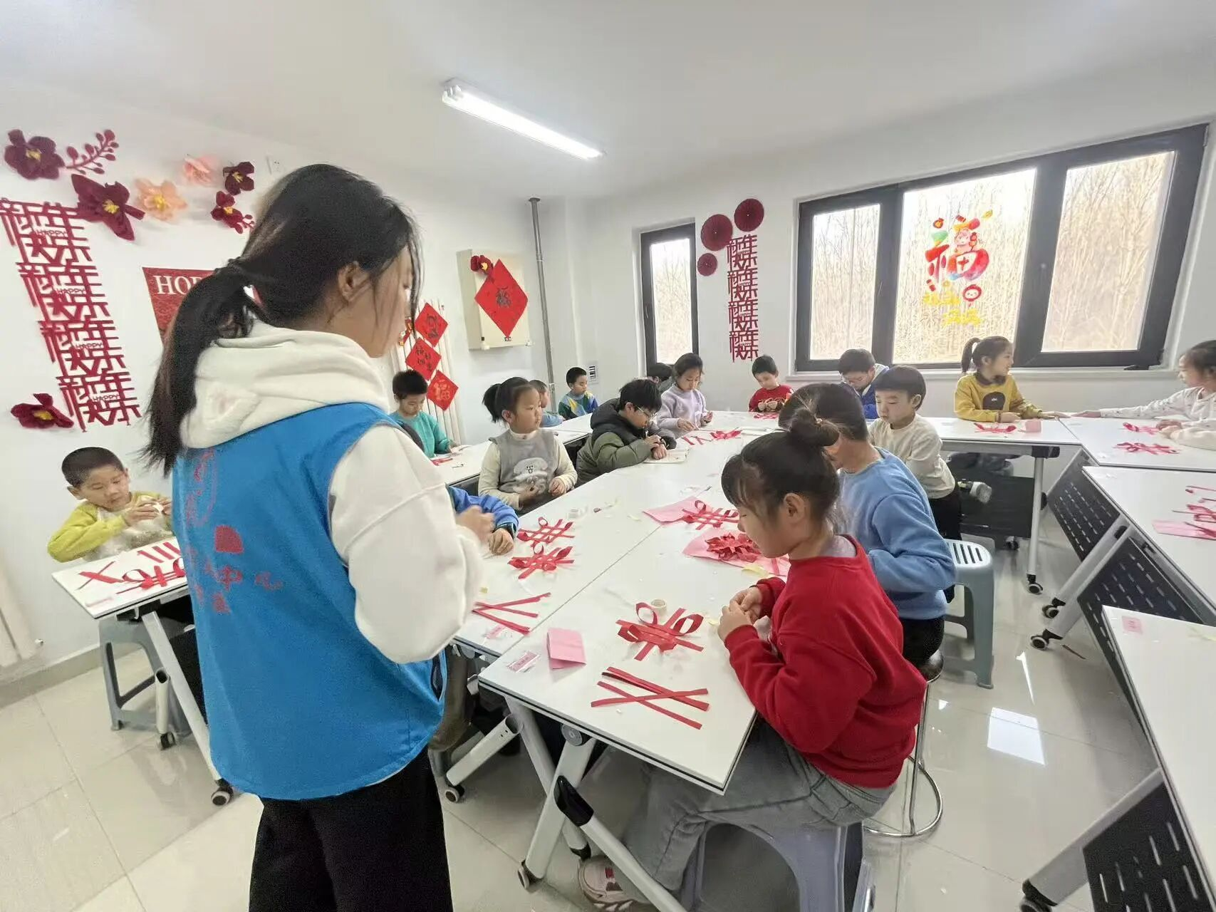 孩子们聚精会神地跟随老师的步骤,从最初的略显生疏到逐渐熟练,一根根红色的纸条在他们的指尖穿梭、交织。经过一番努力,一个个小巧精致的纸编中国结逐渐成形。孩子们高举着自己的作品,脸上洋溢着成功的喜悦。