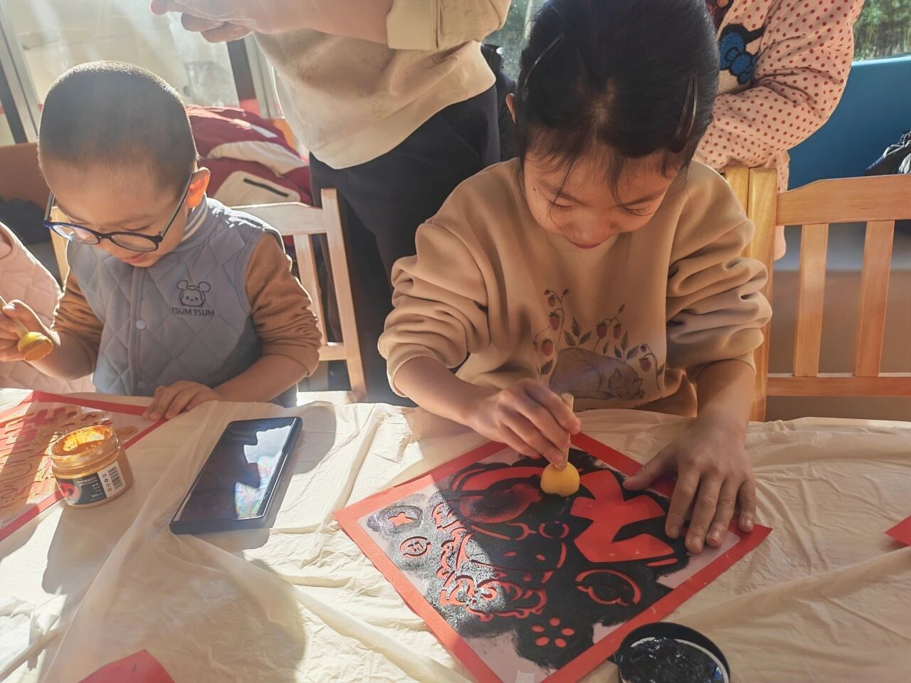 步入节日装点下的图书馆,红灯笼缀满枝头、中国结相映成趣,浓厚的新春气息扑面而来、沁人心脾。首场活动“骏马迎春,文脉传春”非遗拓印传统文化沙龙,便带领孩子们沉浸式解锁传统技艺、触摸非遗温度。活动现场,老师耐心细致地逐步讲解拓印步骤,娓娓分享“福”字背后承载的千年民俗与美好期许。孩子们化身“小小非遗传承人”,小手轻握工具,认真铺纸、轻捶、匀墨,一笔一划间,墨香与年味悄然交融,一张张带着心意与墨香的福字新鲜出炉,既是专属的新年纪念礼物,更是对中华优秀传统文化最纯真、最美好的传承。