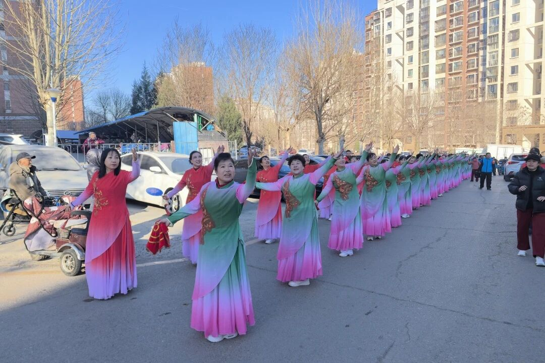当激昂锣鼓与清脆唢呐声响起,巡演正式拉开序幕。秧歌队员身着艳丽服饰,手持彩扇绸带,舞步娴熟、神采飞扬,将新春喜庆氛围展现得淋漓尽致。社区书记与工作人员走在队伍前列,向沿途居民拱手拜年,一句句真挚的新春问候,传递着社区的温暖关怀。