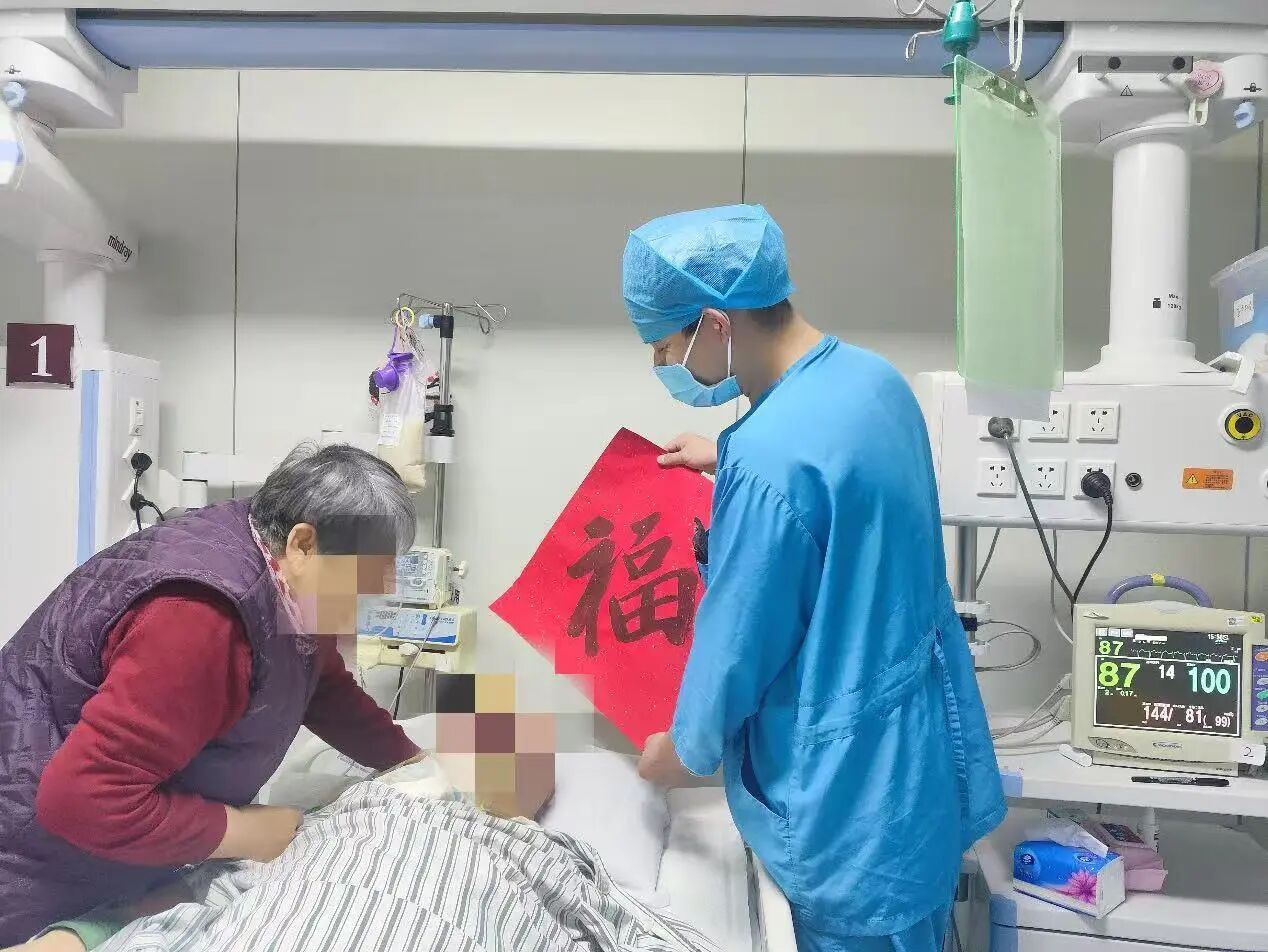 年味,也被医护人员悄悄搬进了病房。1床气切爷爷无法言语,却总盼着沾沾新春福气。护士小杨特意将红福字摆放在他视线正中,一旁的奶奶见此,眼角漾起笑意,爷爷也盯着那抹红,露出了久违的笑容。