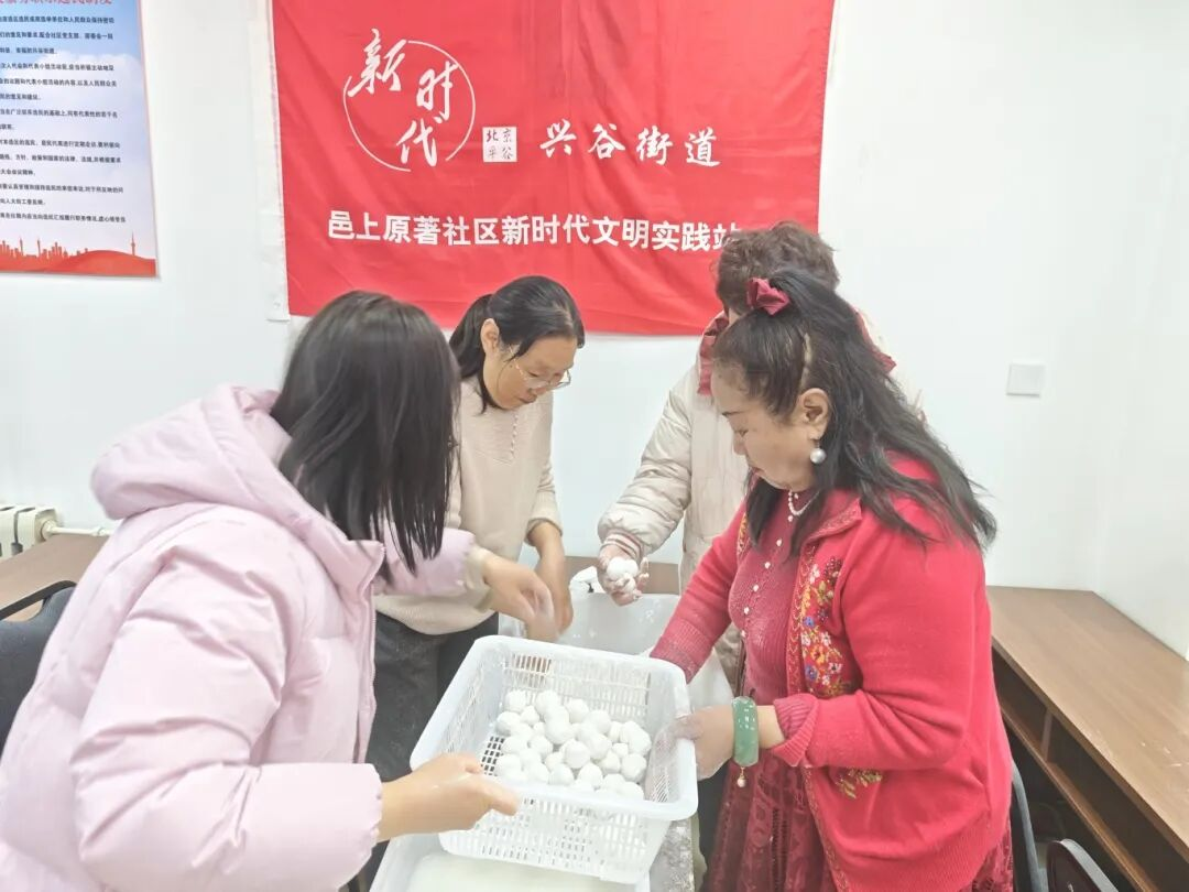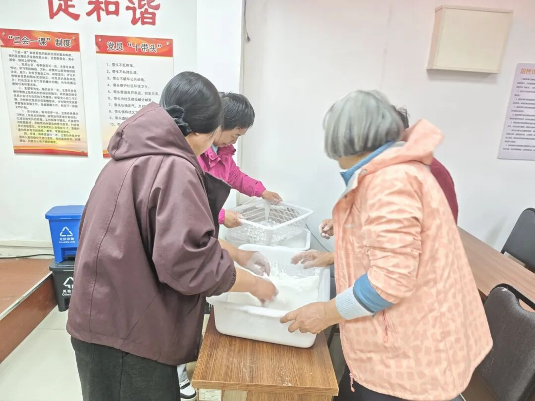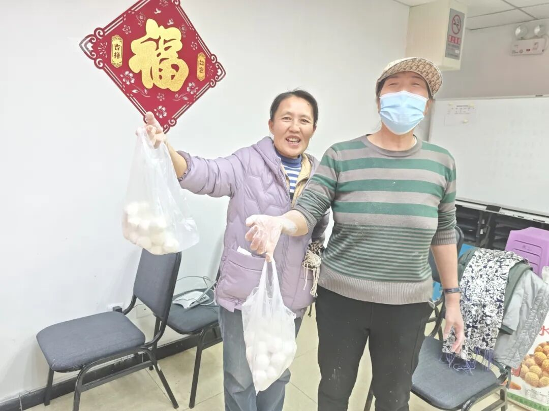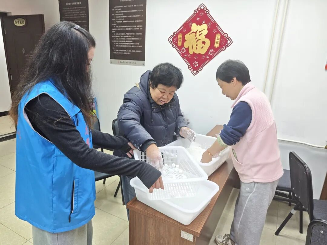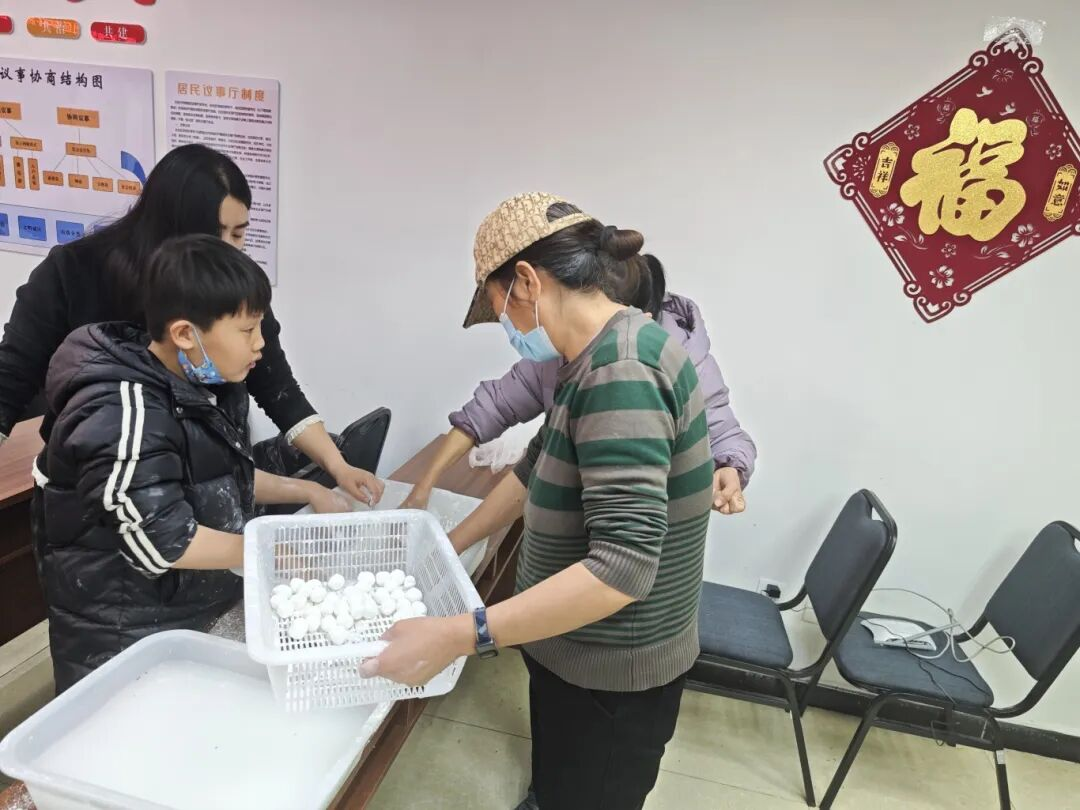 在图书分享的文化熏陶之后,迎来了本次活动最受期待的摇元宵环节。在专业讲师的细致指导下,居民们手持托盘,依次放入黑芝麻馅块儿、糯米粉,亲手体验摇元宵的乐趣。指尖翻飞间,糯米粉层层裹覆,一颗颗元宵逐渐成形,现场满是欢声笑语,每个人的脸上都洋溢着亲手制作的成就感。