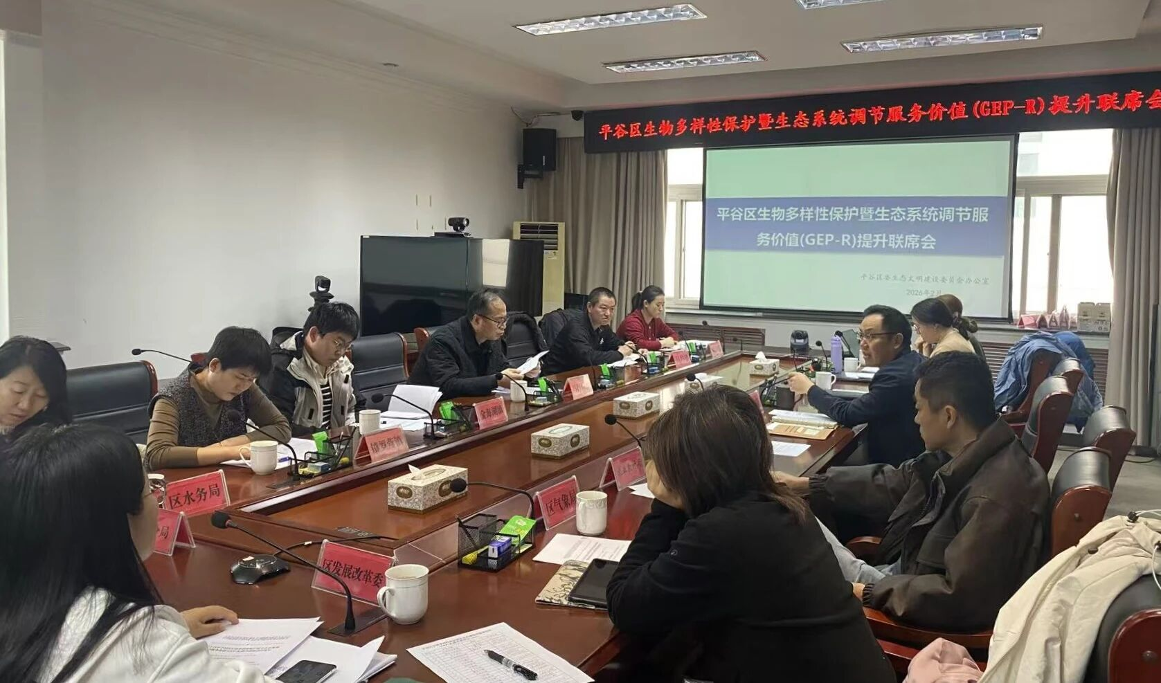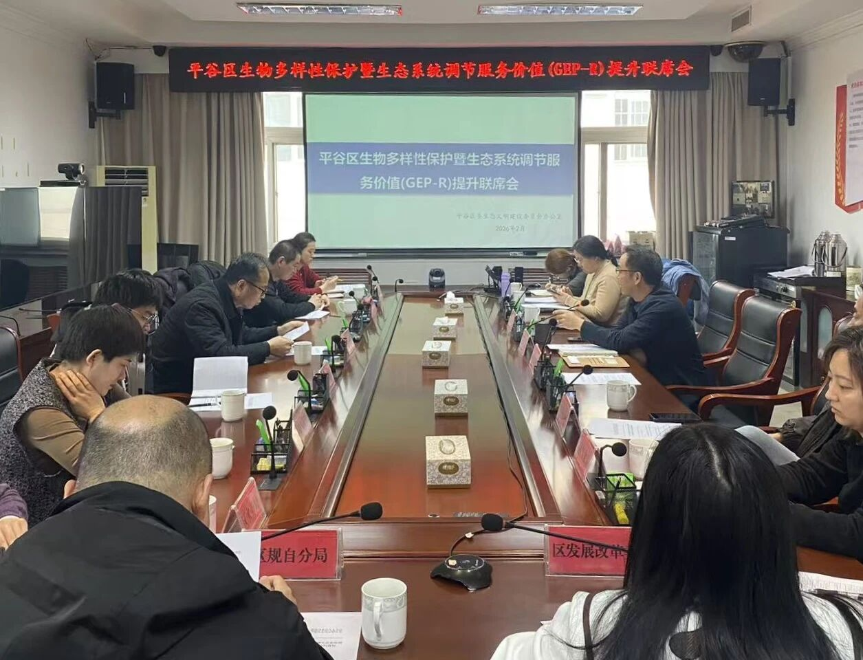 为持续改善生态环境质量,推动生态优势转化为绿色发展优势,2026年2月26日,区委生态文明办组织区发展改革委、区生态环境局、区园林绿化局、市规划自然资源委平谷分局、区水务局、区气象局等部门和乡镇、街道,召开了平谷区生物多样性保护暨生态系统调节服务价值(GEP-R)提升联席会。
