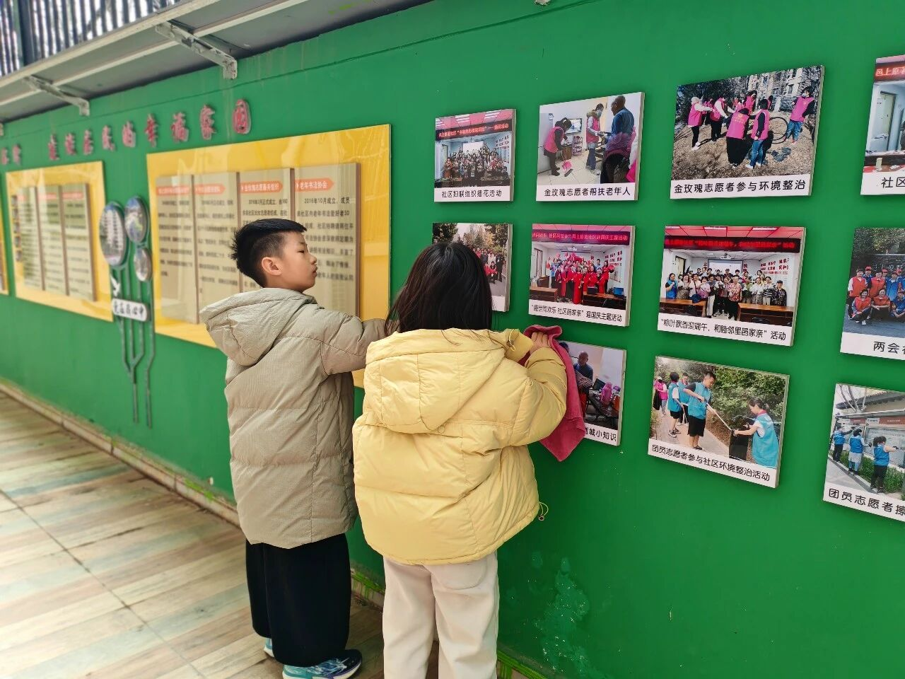 趣味实践结束后,志愿者们化身环保小卫士,拿起工具共同擦拭社区公共宣传栏,清理表面污渍,以实际行动维护社区公共环境,用小小身影传递雷锋精神与环保担当。