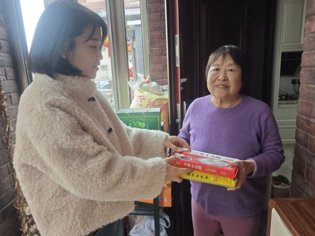 随后,社区书记携手社区工作者与青少年志愿者,分组走进空巢独居老人家中,开展“一对一”暖心慰问。在97岁高龄的郑阿姨家中,志愿者们为老人送上香甜的汤圆和节日祝福,贴心询问她的身体状况和生活需求,反复叮嘱老人注意节日期间的饮食与保暖。这份突如其来的温暖,让郑阿姨深受感动,她紧紧握住工作人员的手,连连致谢:“感谢社区一直惦记着我,让我这个老人家心里热乎乎的!”
