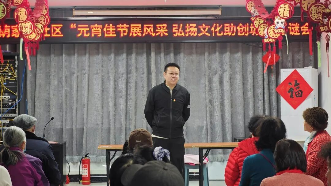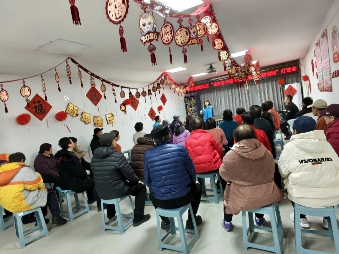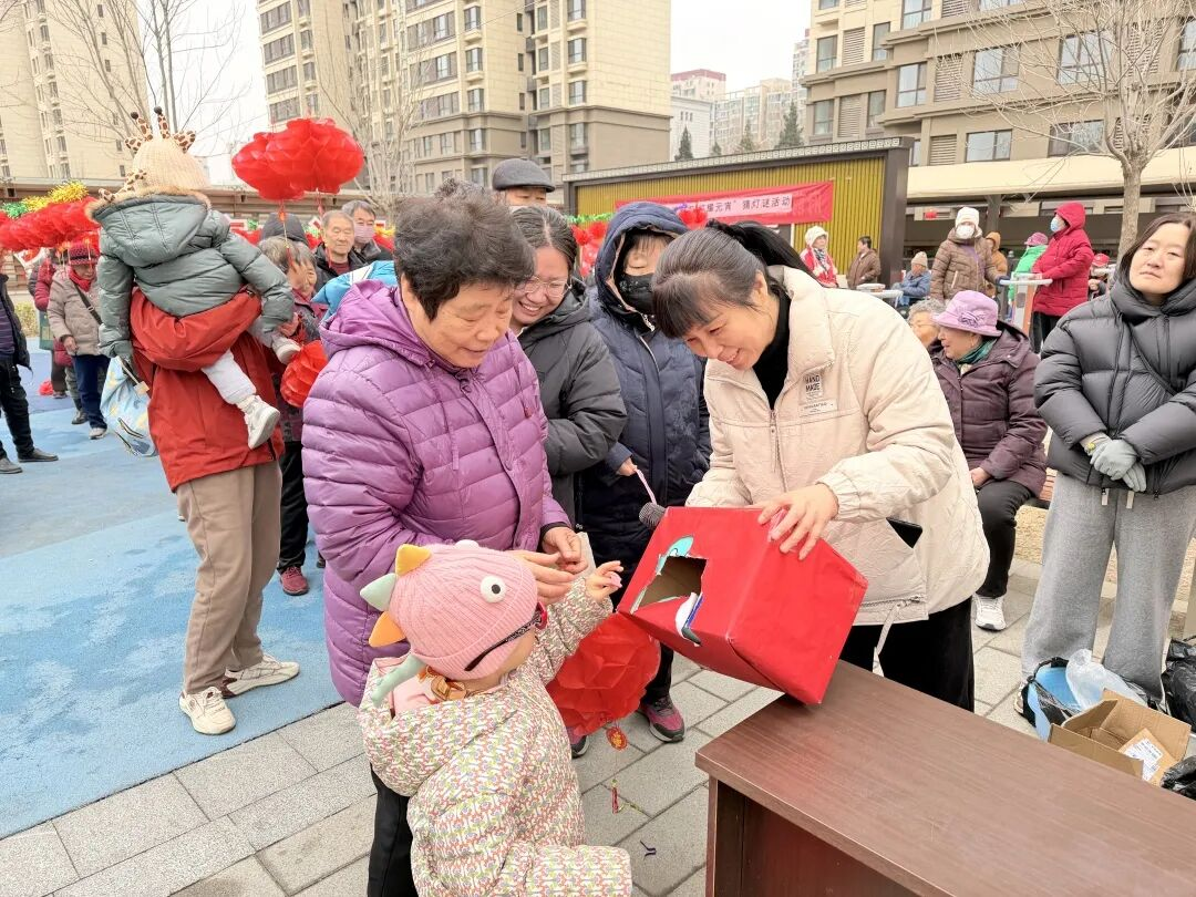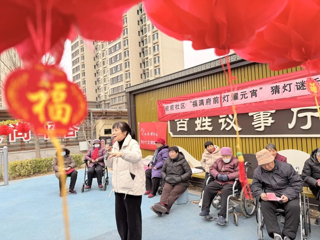 府前社区活动现场红灯笼高挂,氛围喜庆,社区主任崔彩军向居民送上节日祝福,宣传社区重点工作并着重强调“一盔一带”等交通安全注意事项。趣味猜谜环节中,内容丰富的灯谜吸引居民踊跃参与、互帮互助,猜中者可兑换香油等实用礼品,现场欢声笑语不断。