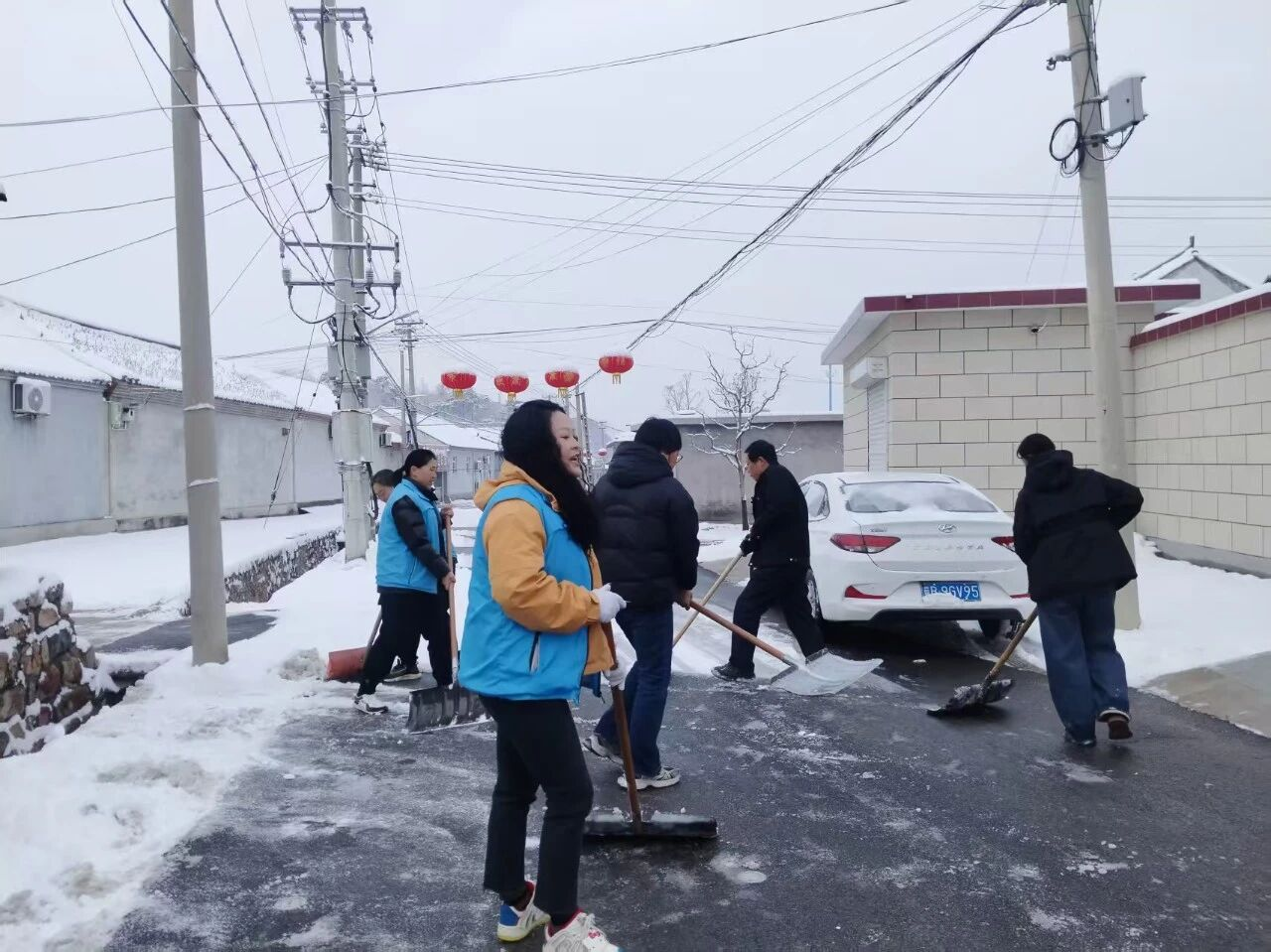 各村“两委”干部闻令而动、靠前指挥,充分发挥先锋模范作用,迅速组织起包含网格员、志愿者在内的扫雪铲冰队伍。大家不畏严寒,纷纷拿起铁锹、扫帚、推雪板等工具,奔赴村内主要道路、街头巷尾。铁锹与地面的摩擦声此起彼伏,奏响了冬日里最暖心的“劳动交响曲”。那一抹抹忙碌的“志愿蓝”,成为了冰天雪地里最亮丽的风景线。