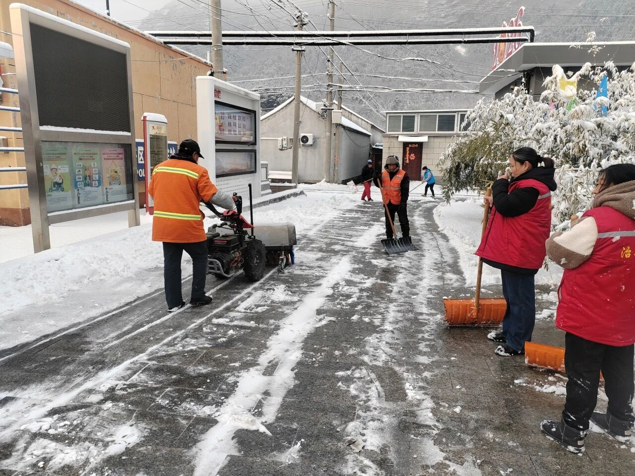 同时,乡域统筹调配机械力量,铲雪车对平程路主干道路开展机械化清障,人工队伍跟进细化清扫,实现“机械+人工”高效联动,做到主干道快清、小巷道精扫、易滑路段除冰防滑。督促各单位、商户落实扫雪铲冰责任,确保全域清扫无盲区、安全保障无死角。