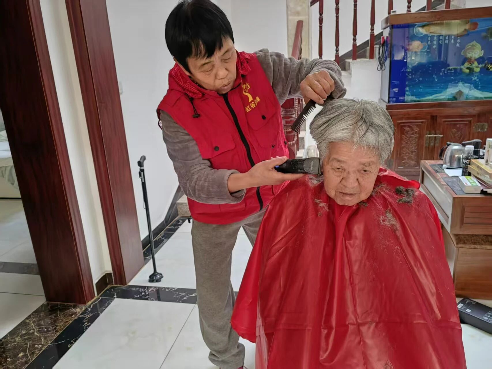 活动现场,志愿者们耐心询问每位老人的理发需求,悉心为他们修剪头发。剪刀翻飞间,老人们的精神面貌焕然一新,脸上洋溢着满意的笑容。针对行动不便的高龄老人,志愿者们还提供上门服务,将理发服务送到老人家中。“我腿脚不好,出门不方便,你们能来家里帮我剪,真是太贴心了!”一位老人拉着志愿者的手连连道谢。