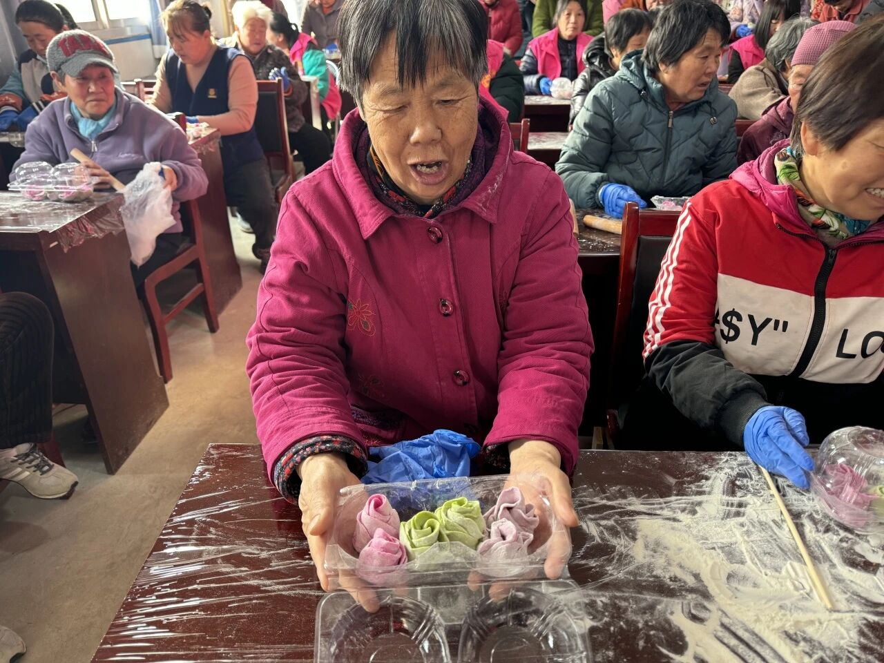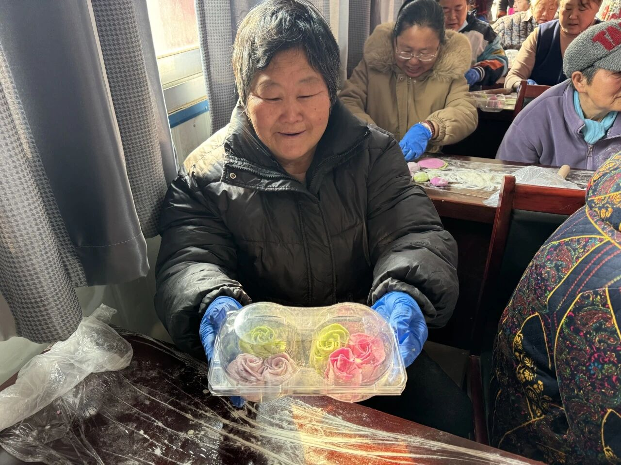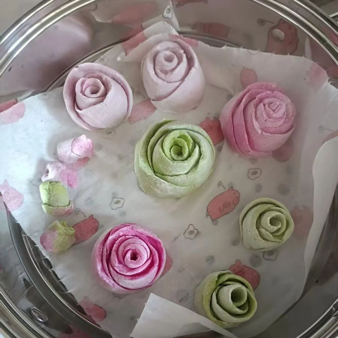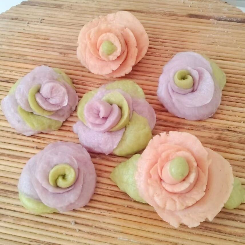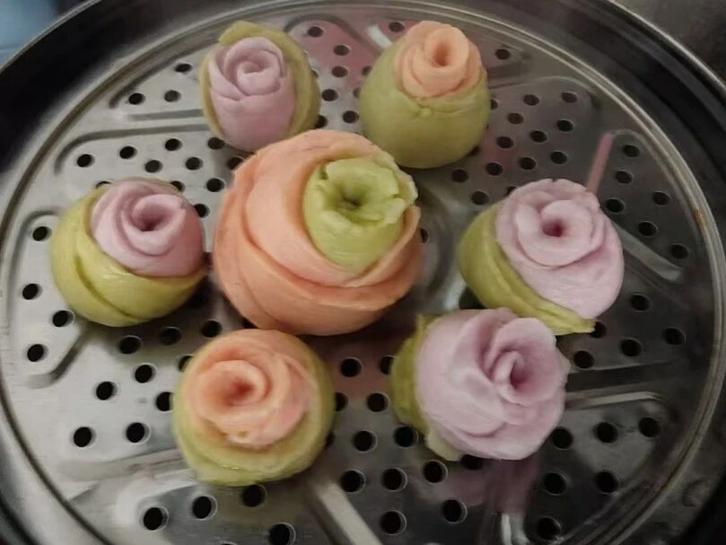 讲解结束后,妇女同胞们纷纷动手实践,揉面、擀皮、捏形、点缀,忙得不亦乐乎。志愿者们全程贴心陪伴、耐心协助,针对大家操作中遇到的难题,一对一进行指导,手把手传授技巧,帮助大家掌握捏制要领。不一会儿,一朵朵造型逼真、形态各异的玫瑰花花馍逐渐成型,有的娇艳饱满、层层叠叠,有的小巧玲珑、精致可爱,粉色、紫色的面团经过大家的巧手点缀,仿佛一朵朵盛放的玫瑰,每一件作品都凝聚着大家的巧思与热爱,承载着对幸福生活的期盼与对彼此的美好祝福。