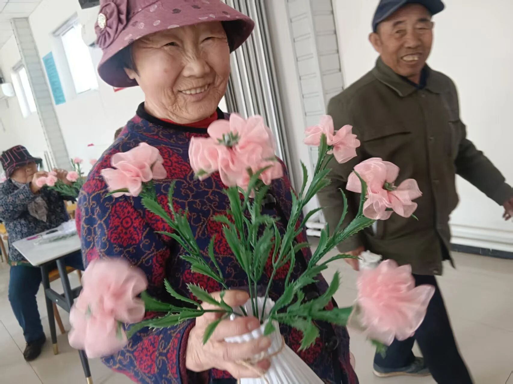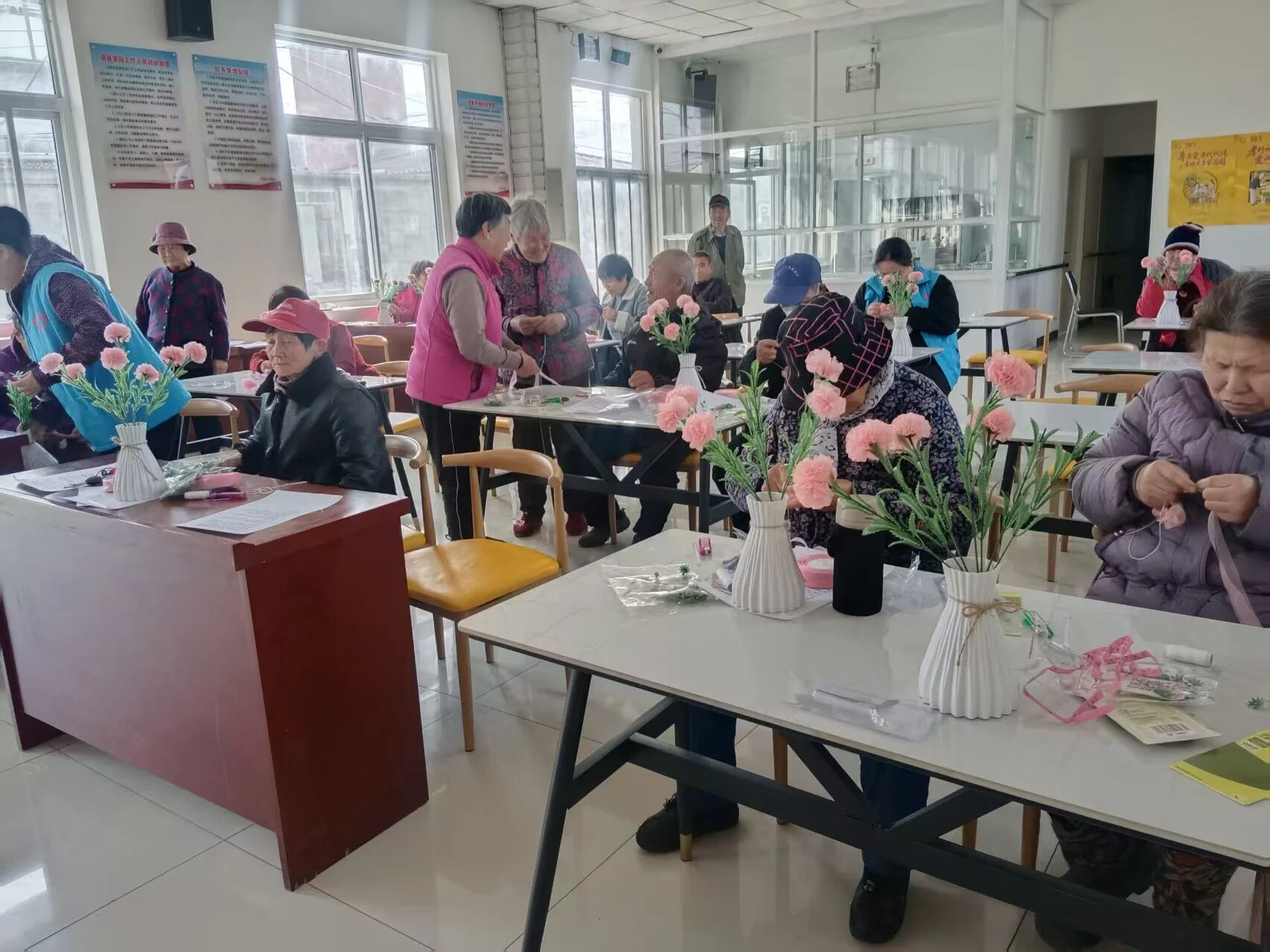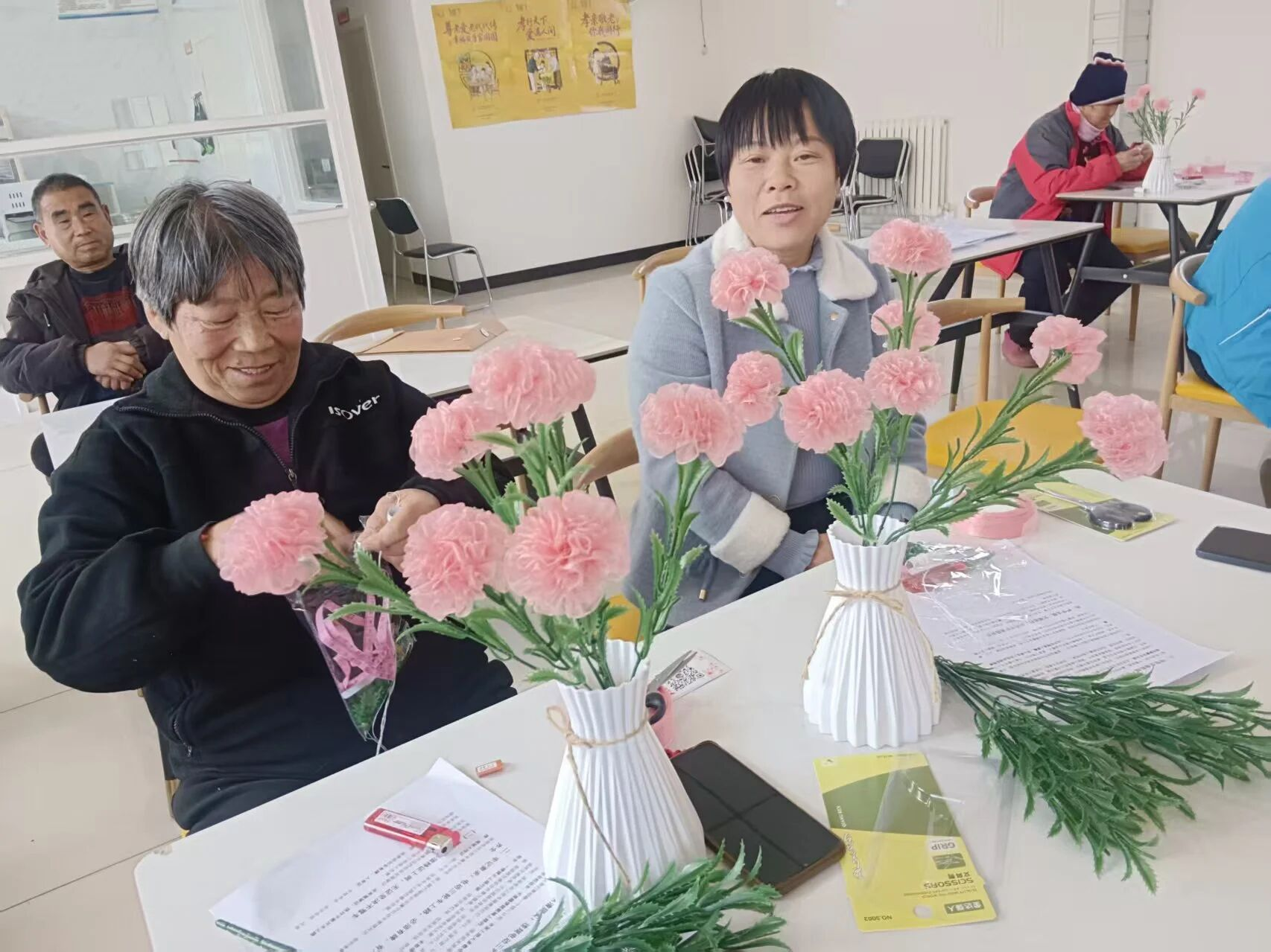 大家听得认真、学得投入,纷纷动手实践起来。裁剪丝带、卷出花瓣、粘贴固定、整理花型,一系列动作有条不紊。有的互相交流技巧,有的主动帮助操作不熟练的伙伴,现场欢声笑语不断,处处洋溢着互助友爱的温暖氛围。一条条粉色丝带在大家的巧手中化作一朵朵栩栩如生、娇艳动人的康乃馨。