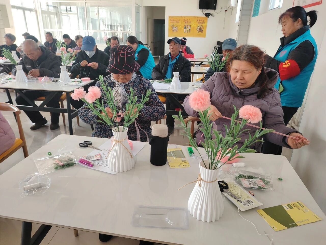 活动现场暖意融融,氛围温馨而热烈。志愿者们提前备好粉色丝带、剪刀、花瓶、花杆等手工材料,化身“手工老师”,耐心细致地为大家讲解康乃馨花束的制作方法。从丝带的裁剪、卷制,到花瓣的塑形、固定,再到花叶的搭配点缀,志愿者们手把手教学、一对一指导,放慢节奏、反复示范操作要领,细致解答大家遇到的每一个问题,确保大家都能参与其中、收获乐趣。