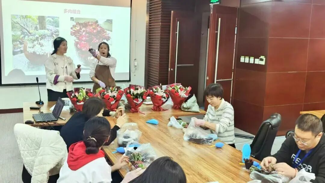 活动现场各类新鲜花、多肉植物错落摆放,本次活动以“多肉盆栽组合手作”为核心,区文物管理所还特别邀请了专业花艺老师到场指导,老师首先为大家讲解了插花艺术的历史渊源,巧妙地将历史文化的传承与花艺创作里对美的追求相联系,让女职工们在领略花艺魅力的同时,更增添了对本职工作的认同感与自豪感。