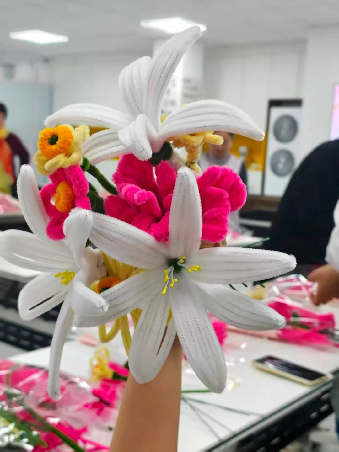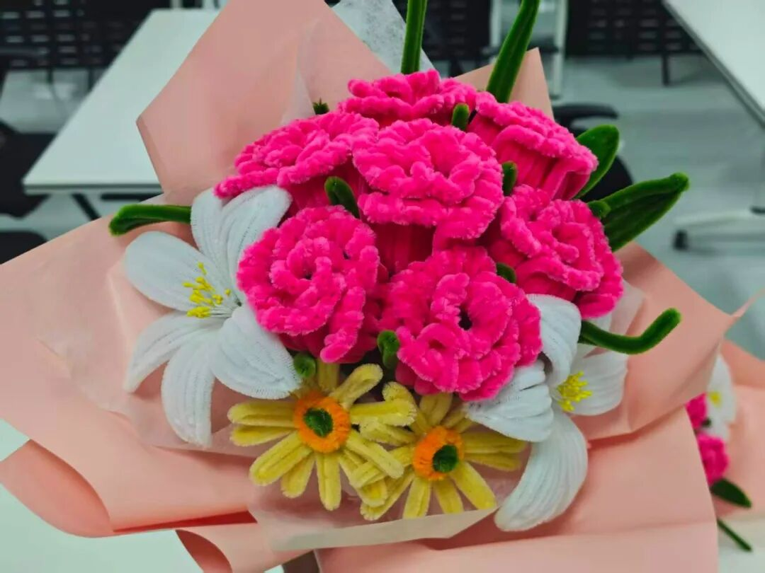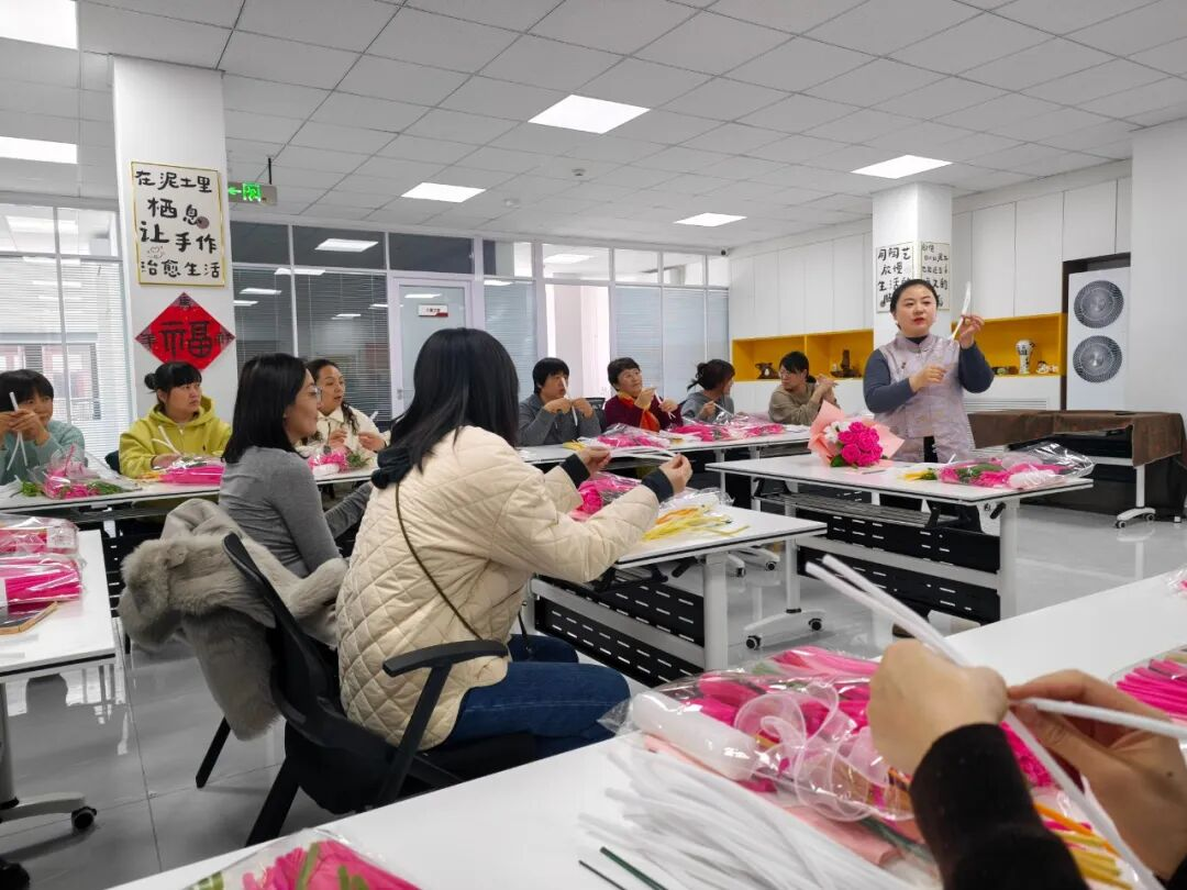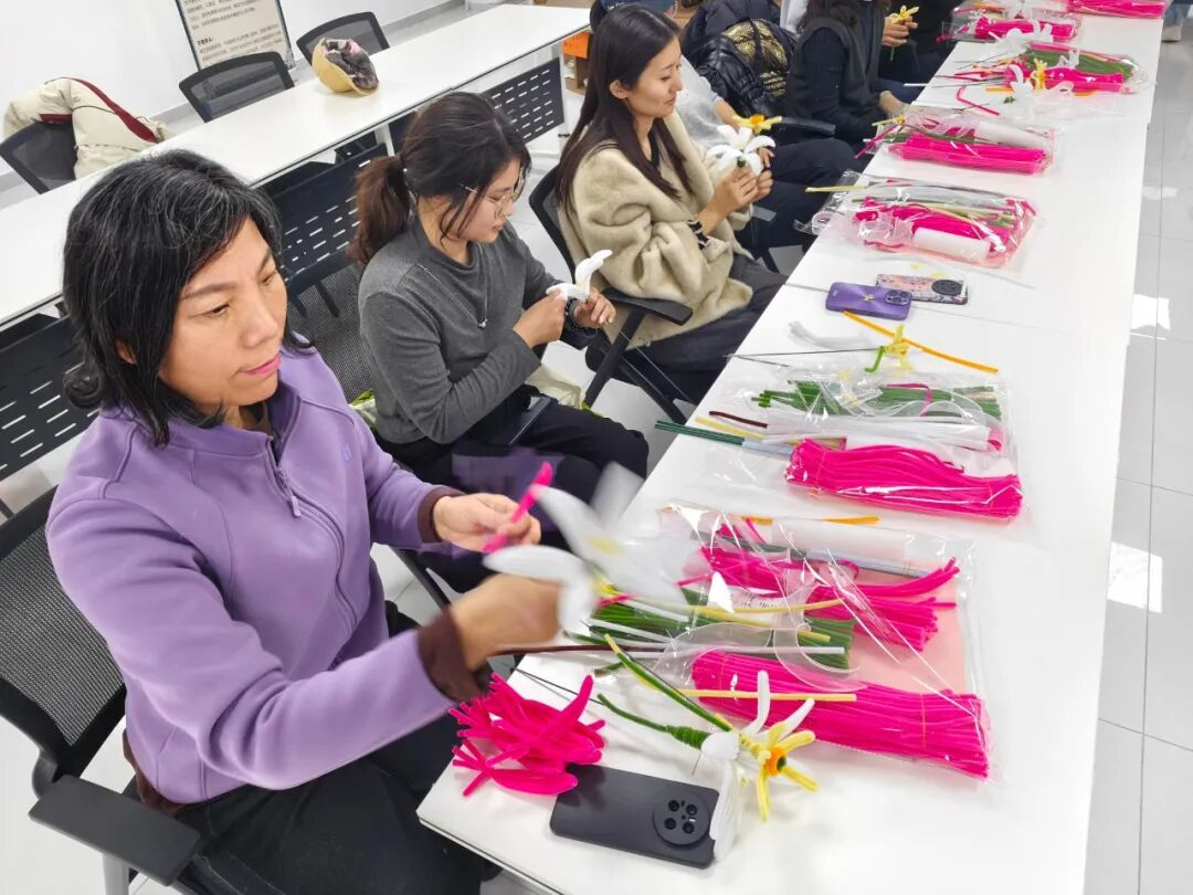 女职工们兴致勃勃、踊跃参与,认真聆听讲解,互相交流经验、切磋技艺。大家发挥巧思,将一根根普通的扭扭棒精心弯折、缠绕,一朵朵栩栩如生的玫瑰花、百合花、小雏菊悄然绽放。经过巧手创作,一束束精致可爱、创意十足的手工花束陆续完成,现场充满了欢声笑语。