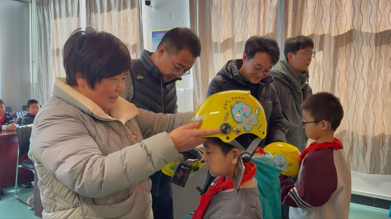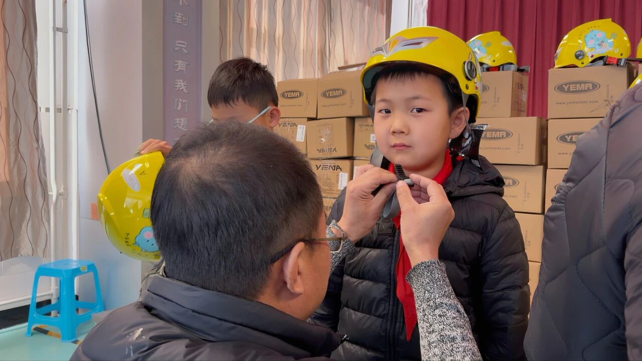 交接仪式上,教科文体办、平安建设办公室的工作人员与学校老师一起,为13名学生代表戴上了崭新的头盔。