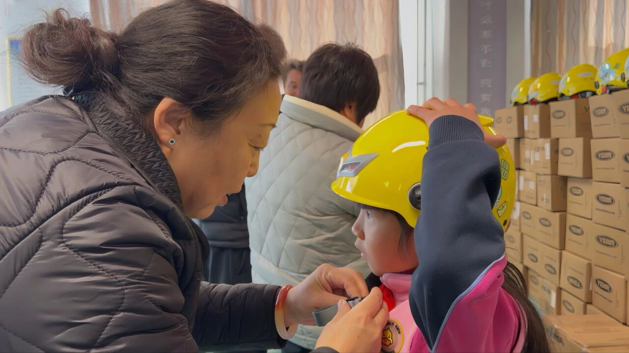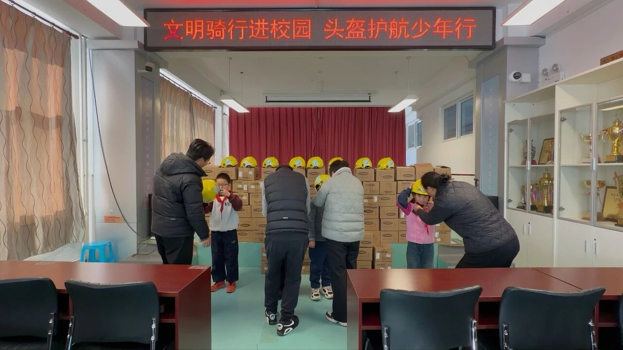 他们细心地调整系带,讲解佩戴要点,并反复叮嘱孩子们注意安全。“来,试试合不合适,系带要留一指宽。”老师一边帮孩子调整头盔,一边耐心地说:“还要提醒爸爸妈妈、爷爷奶奶,骑电动车也必须戴头盔。”孩子们认真点头回应。此次共有13名学生作为代表现场领取头盔,同时也接过了 “回家教家长” 的小小宣传任务。余下 82 顶头盔,将由学校后续陆续发放到每位学生手中。