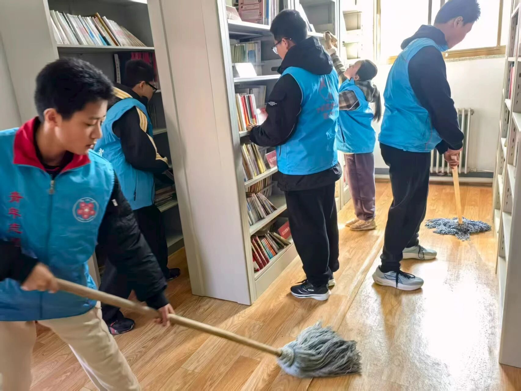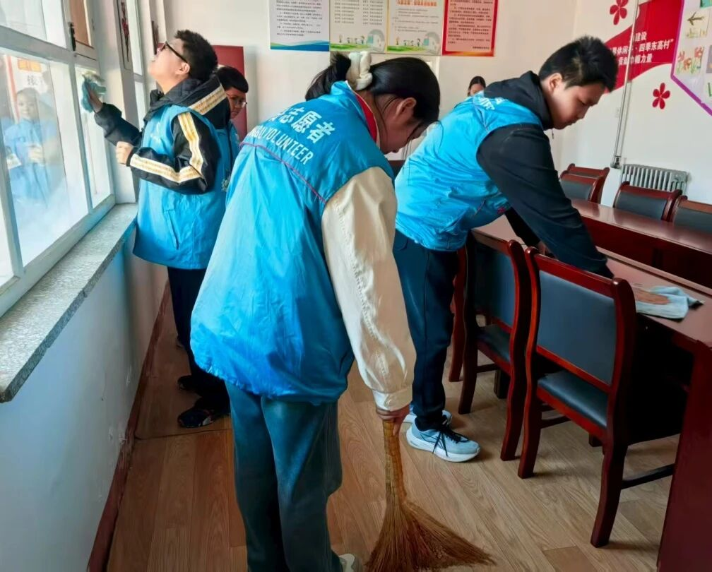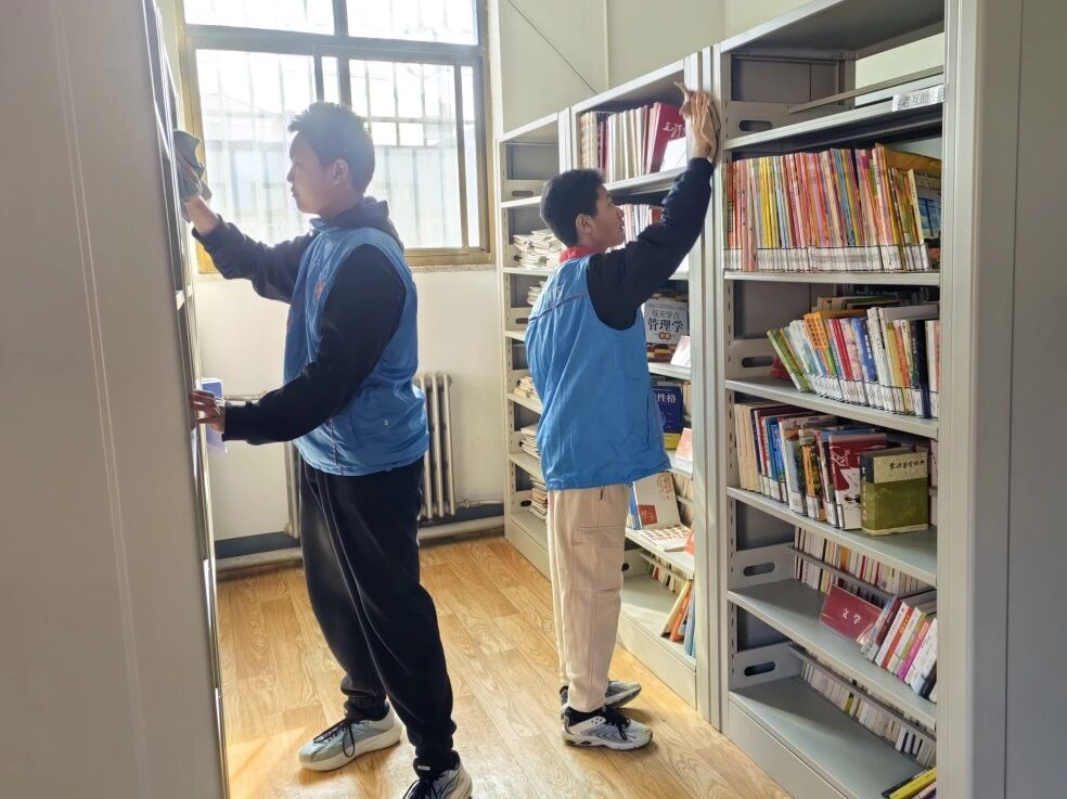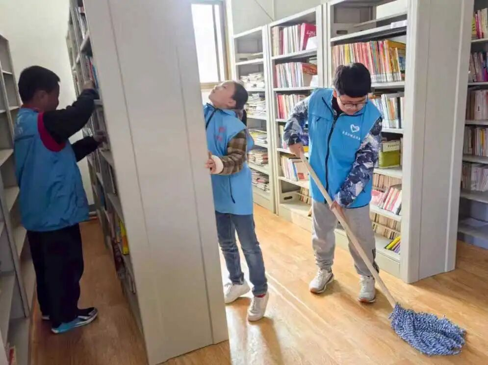 活动中,青年志愿者们分工明确、协同配合,对公共区域进行清扫整治。在图书室,志愿者们细心整理书籍、规范分类归架、认真擦拭书架,将散落图书逐一梳理归位,打造整洁有序、温馨舒适的阅读环境,让书香浸润乡村、滋养心灵。