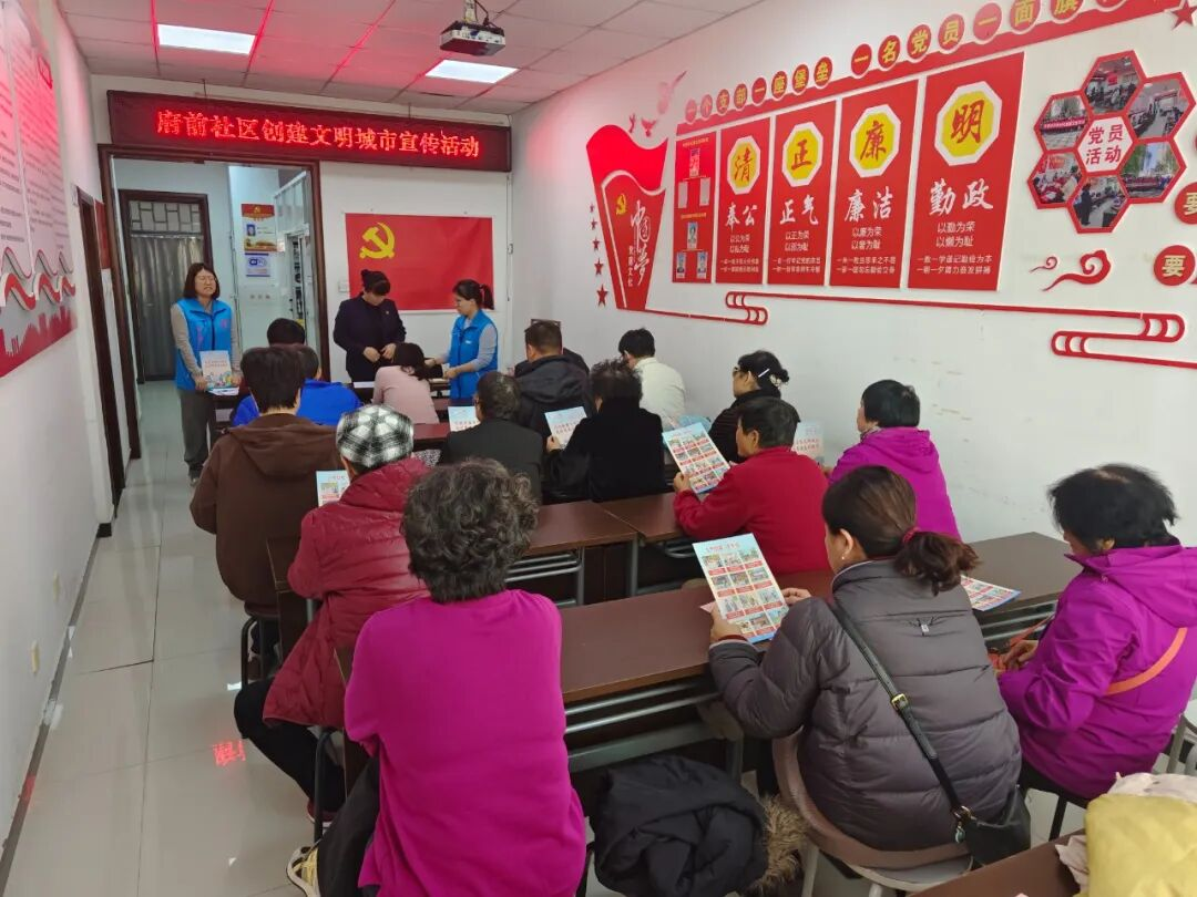 为扎实推进文明城区创建工作,全面提升居民知晓率、参与率与和支持率,府前社区坚持党建引领、全民参与,创新宣传方式、拓宽覆盖范围,以红色宣讲进楼栋、“明白卡”广普及、暖心敲门入户行三项举措,构建全方位、立体化、无死角的创城宣传格局,让文明理念走进千家万户、浸润民心。