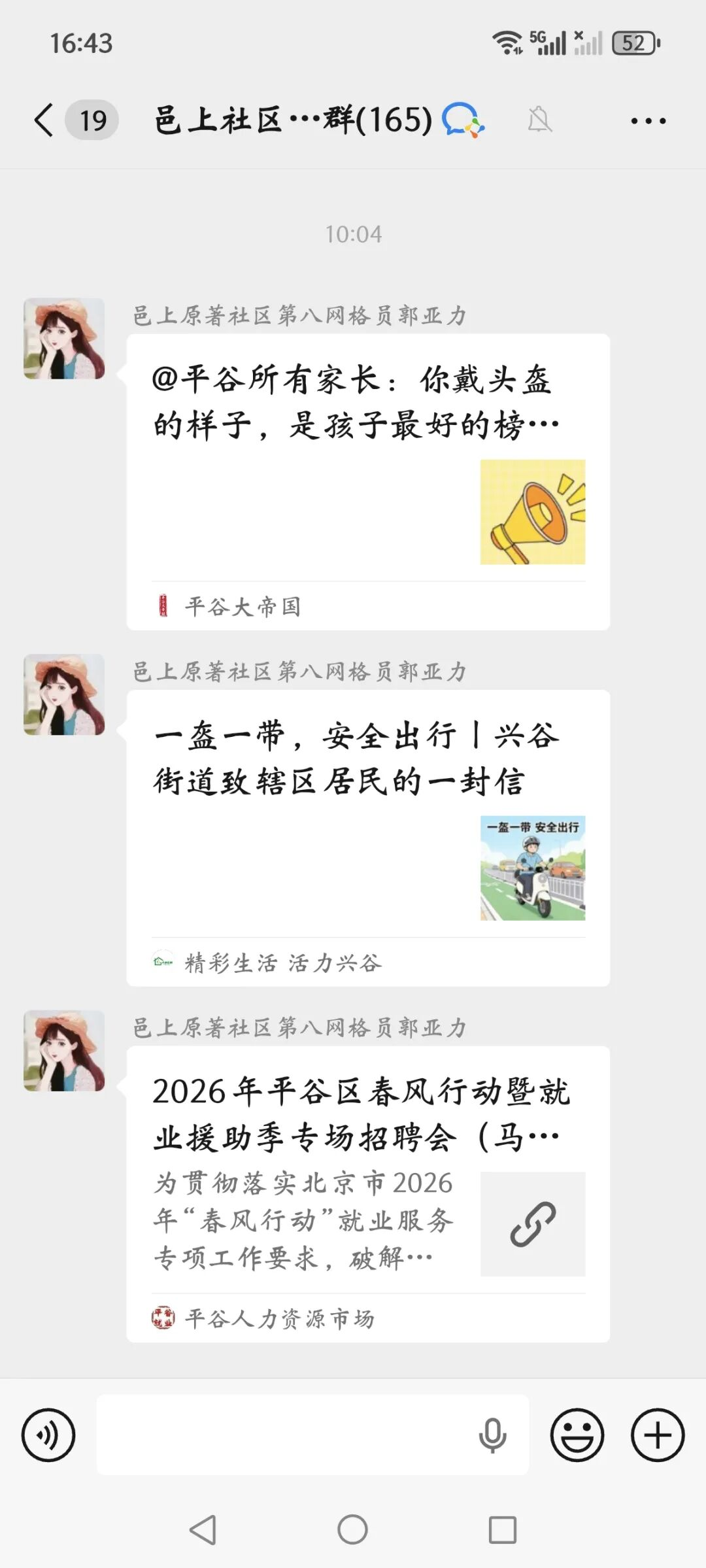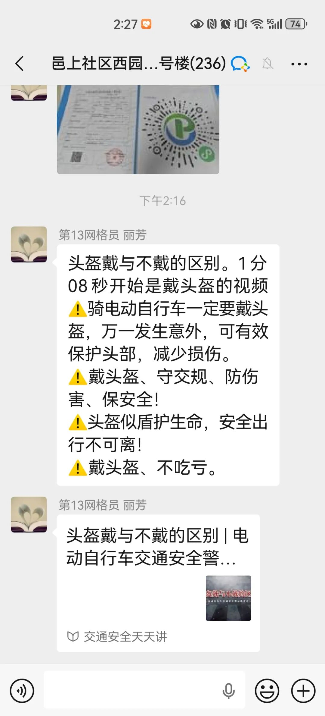 同时,聚焦老年人、未成年人等重点群体开展“一对一”温馨提示,细致讲解出行注意事项,叮嘱家人相互提醒、相互监督,自觉遵守交通法规,争做文明出行的践行者与守护者。社区坚持宣传常态化,除依托居民群每日线上推送安全提示外,还在小区出入口通过小喇叭循环播放宣传内容,让安全意识时刻伴随居民左右。