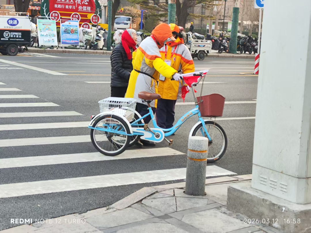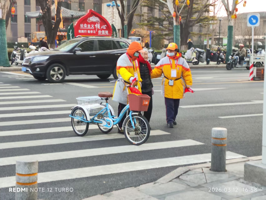 经耐心询问,老人家住天客隆附近,因未携带手机、记不清子女电话,一时找不到回家的路。两位引导员分工协作,一人小心搀扶老人过马路,一人帮忙推车,全程贴心守护。 此时,一位热心行人路过并认出老人。李桂霞、王立凤迅速说明情况,在确认安全后,将老人托付给热心行人护送回家。
