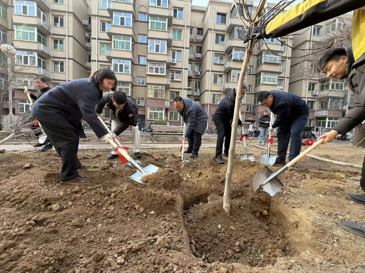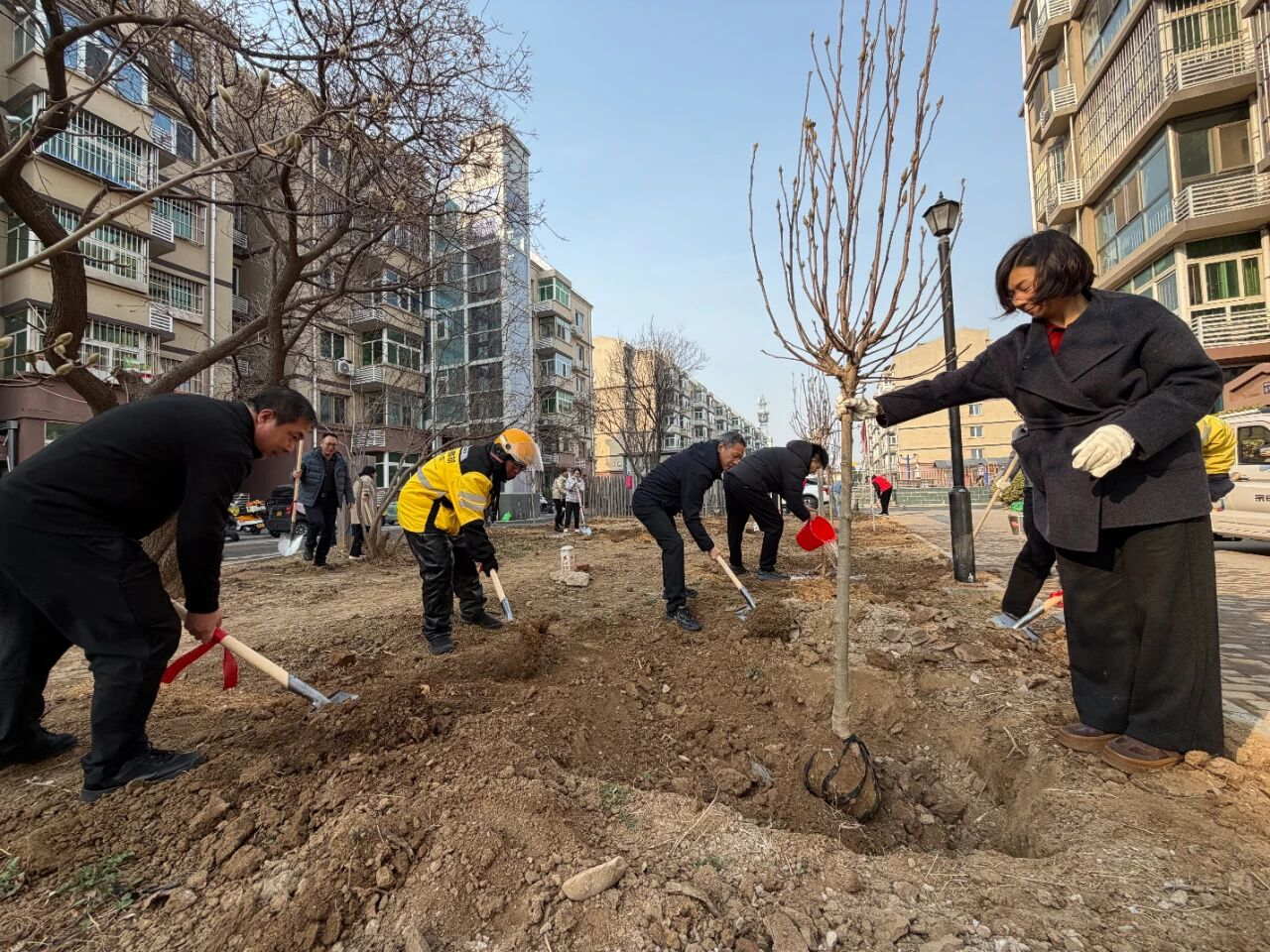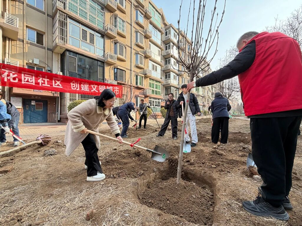 在栽种一株苗环节,现场秩序井然。大家分工协作、默契配合,严格按照栽植标准,挥锹挖坑、扶苗填土、围堰浇水,每一道工序都细致认真、规范到位。针对小区空白绿地、绿化薄弱区、缺株断垄点位进行集中补植,精心打造景观化、精致化绿色小微节点,进一步提升辖区绿化覆盖率,让社区环境更清新、更美观。