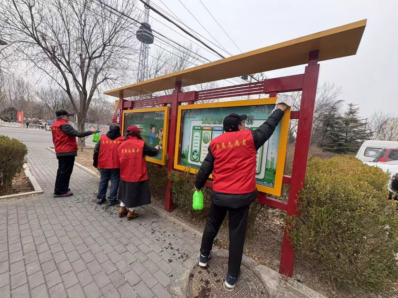 活动中,党员志愿者们分工明确、干劲十足。大家手持垃圾袋、夹子、抹布等工具,对社区内绿化带、道路两侧、公共设施周边的白色垃圾进行全面清理,不放过任何一处卫生死角;同时认真擦拭社区宣传栏等公共设备,清除表面灰尘与污渍,让社区环境焕然一新。此外,志愿者们还向周边居民宣传环保知识,倡导大家自觉爱护环境、不乱扔垃圾,共同守护美丽家园。