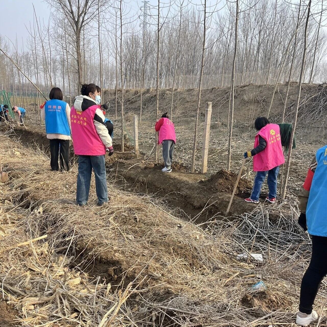 在马昌营村与西海子村交界处,身着粉色马甲的志愿者们正忙碌着。她们三人一组、五人一群,挖坑、扶苗、培土、踩实、浇水……每一道工序都做得一丝不苟。汗水挂在脸上,笑容却洋溢在眉梢。看着亲手种下的树苗在春风中挺立,大家的喜悦之情溢于言表。粉色马甲与绿色树苗交相辉映,成为春日里一道亮丽的风景线。经过大家的共同努力,一棵棵新栽种的树苗迎风挺立、错落有致,为裸露的土地披上了绿装。