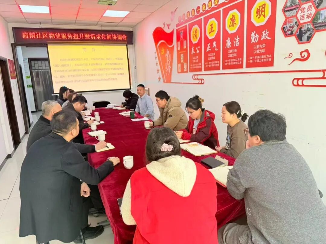 为进一步提升为民服务水平,加强与辖区物业的沟通协作,推动小区服务提质增效,近日,府前社区组织召开物业服务提升暨诉求化解协调会。辖区物业公司负责人、各部门经理、楼管等相关岗位人员参加会议,街道物业科科长张涛到场指导工作。