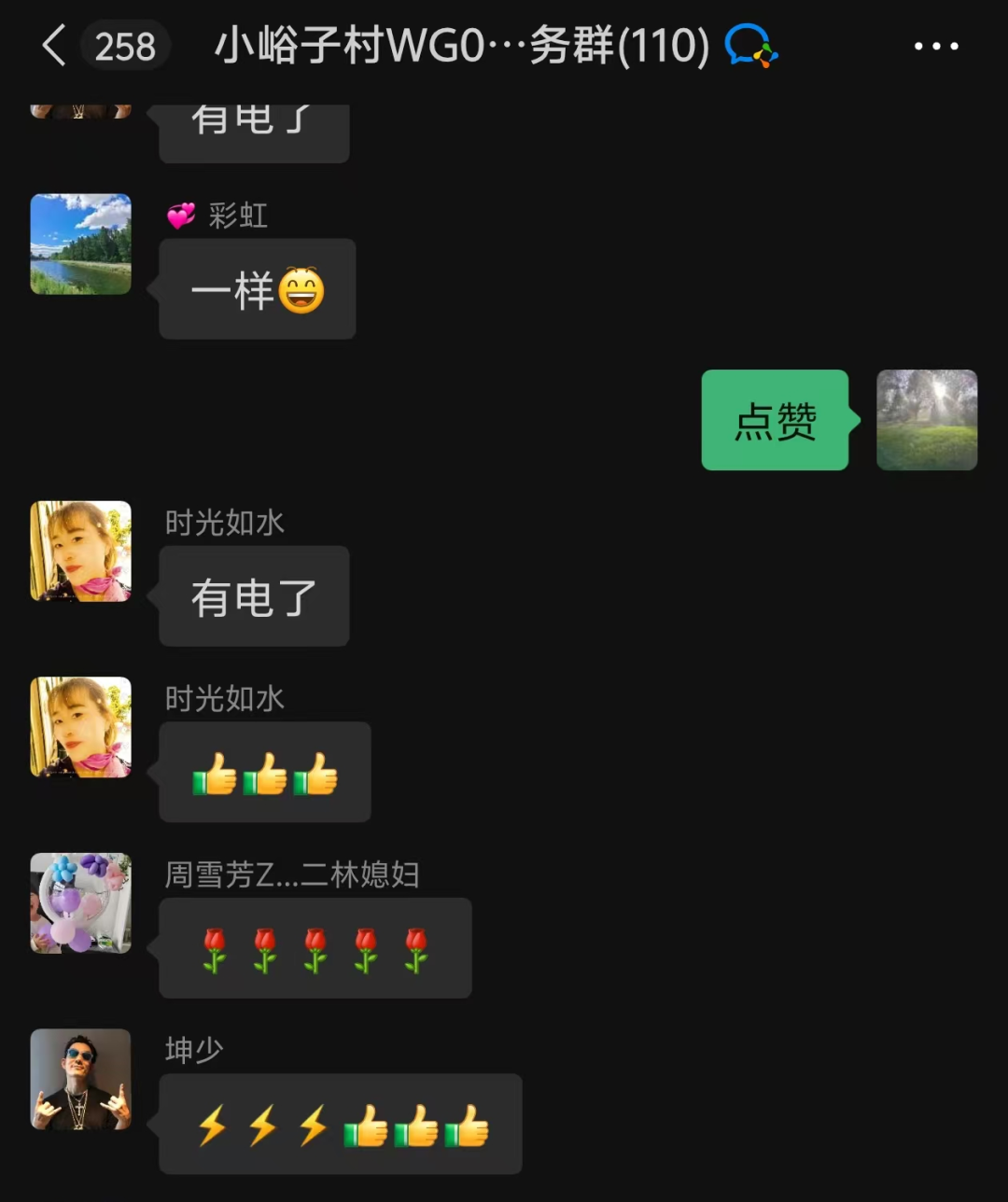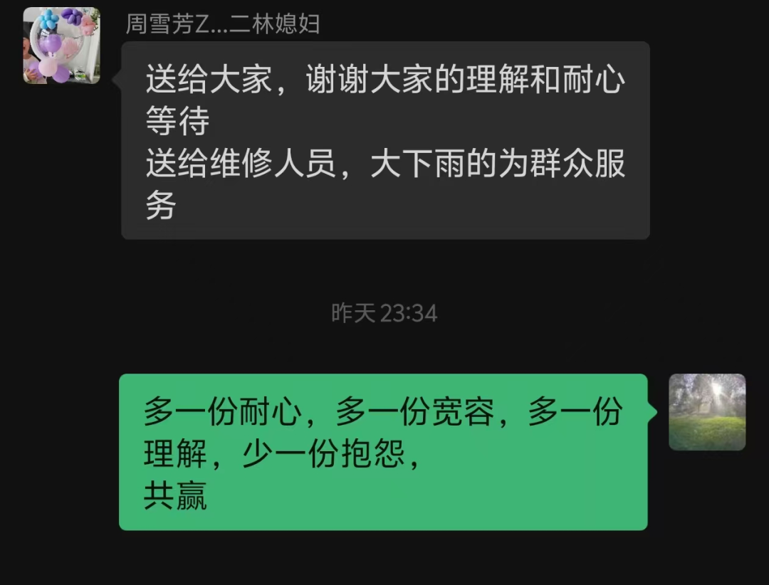 经过连夜奋战,受损线路逐步恢复供电,村民家中的灯一盏盏重新亮起。此时已近午夜十二点,村微信群里消息不断,村民们纷纷为村干部和抢修人员的连夜付出点赞。