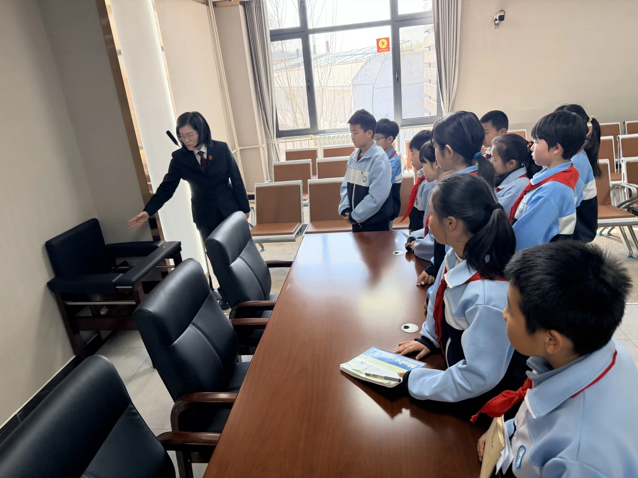 之后,同学们来到审判庭,何雨亭副庭长讲解法庭布置、法徽含义,并带孩子们体验穿法袍、敲法槌,沉浸式感受司法威严。从司法案例到实践举措,从生态保护到水源守护,同学们在边走边看边学中读懂“两山”理念,心中种下守护生态的种子。