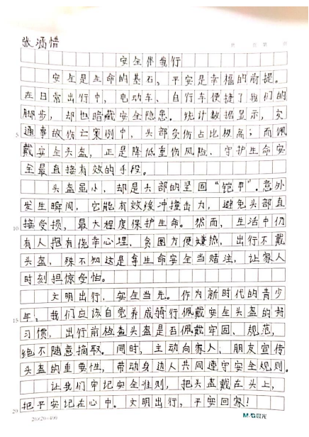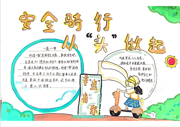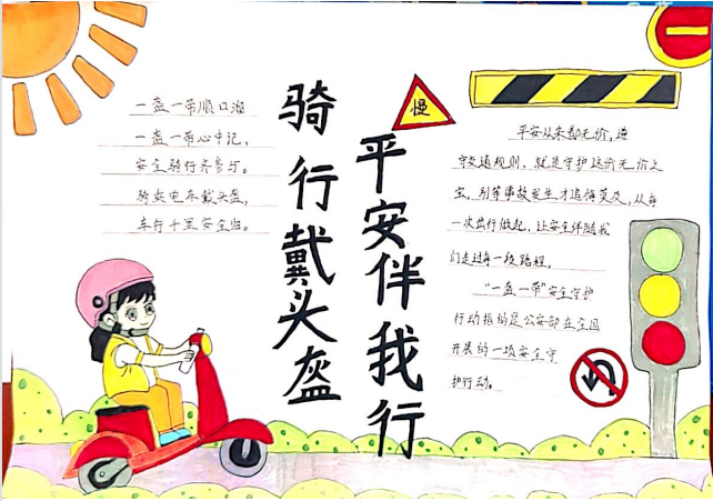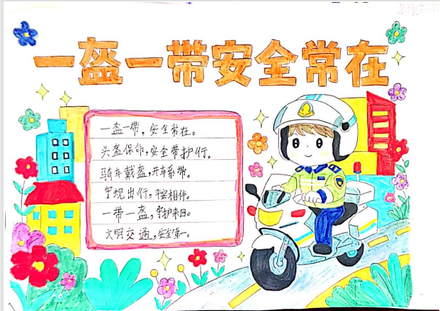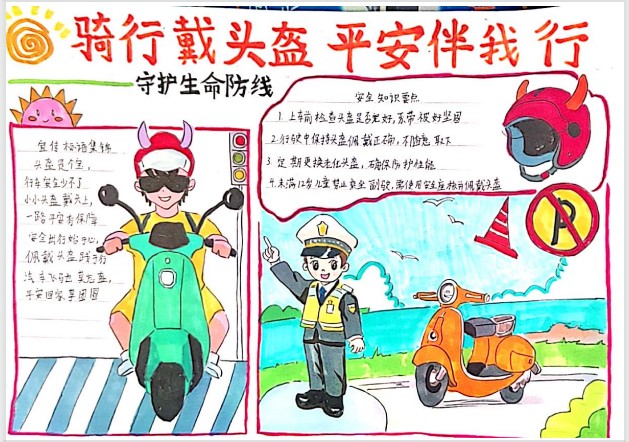 开展“骑行戴头盔,平安伴我行”主题作品征集活动,鼓励学生用画笔和文字表达对交通安全的感悟,对优秀作品予以表彰并每人奖励一顶头盔,让安全理念在创意中内化于心、外化于行。