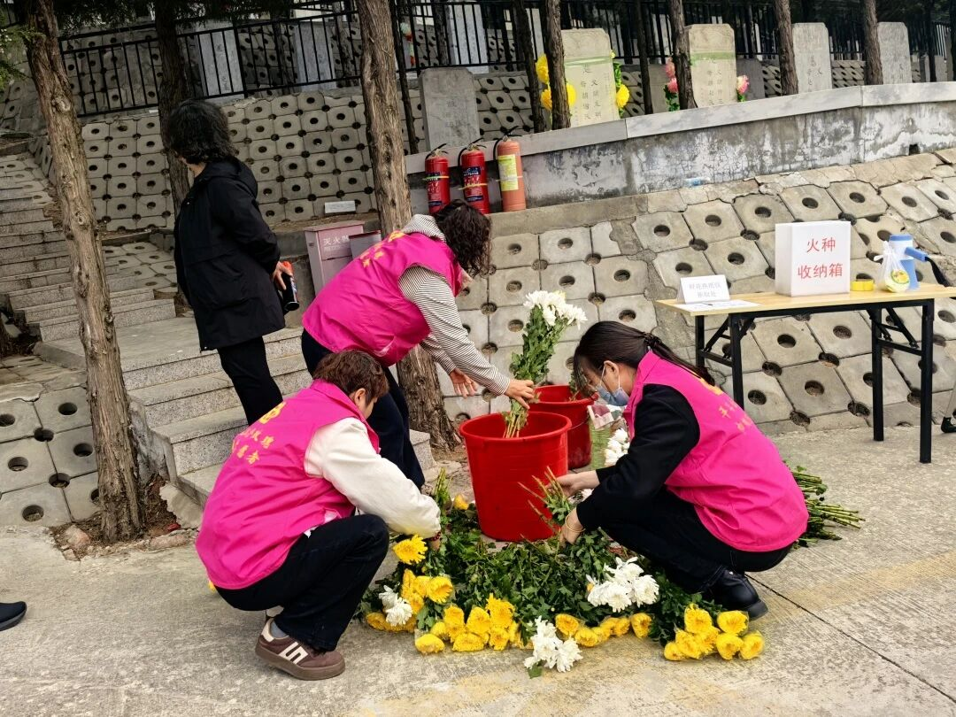在墓地入口处,村委会专门设立文明祭扫服务岗,摆放着黄白菊鲜花,开展“鲜花换纸钱”专项活动。村民可将随身携带的纸钱、冥币等传统祭祀用品,免费兑换成寓意思念的鲜花,以献花、默哀、擦拭墓碑等环保方式寄托哀思,告别以往烟火缭绕、纸灰飞扬的祭扫场景。耐心引导大家转变传统观念,让缅怀之情更纯粹、祭扫行为更文明。不少村民纷纷表示,用鲜花代替纸钱,既表达了对先人的追思,又能保护生态环境、消除火灾隐患,这样的祭扫方式更有意义。