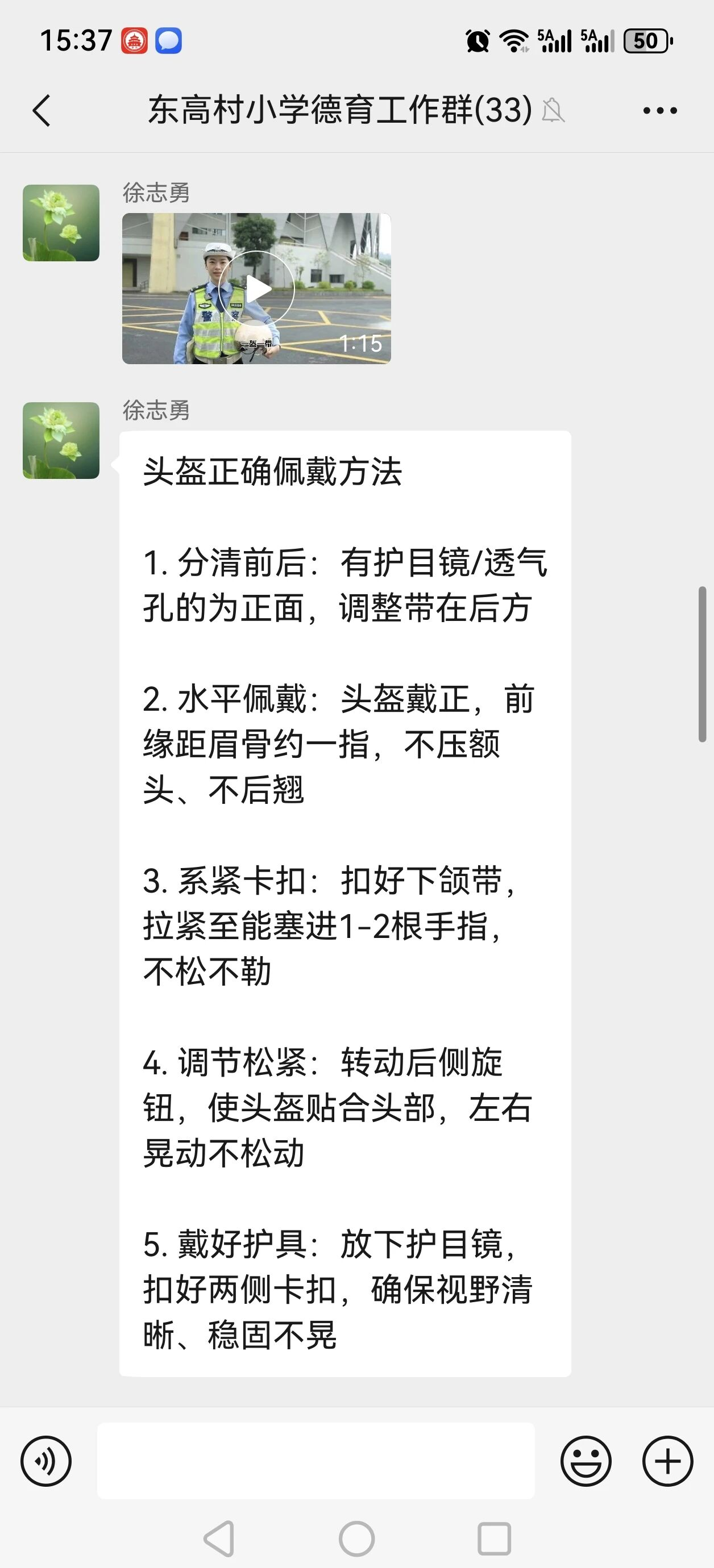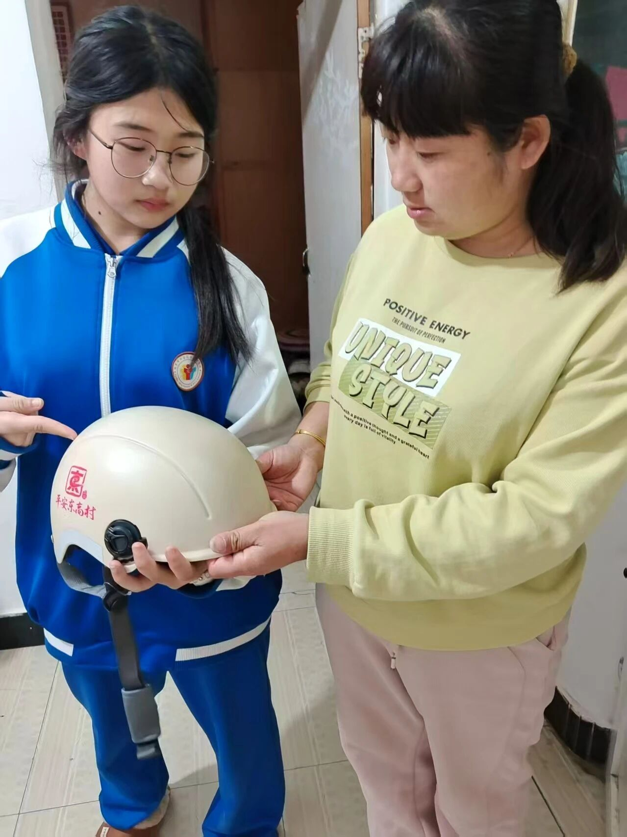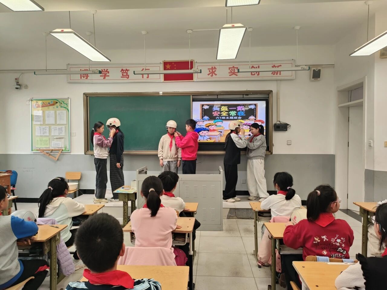主题班队会上,印有东高村镇标识的爱心头盔整齐摆放。各班积极建立班级头盔轮流使用机制,同学们现场演示、实操练习,熟练掌握正确佩戴方法,让安全知识从“入耳入心”真正变为“动手践行”。