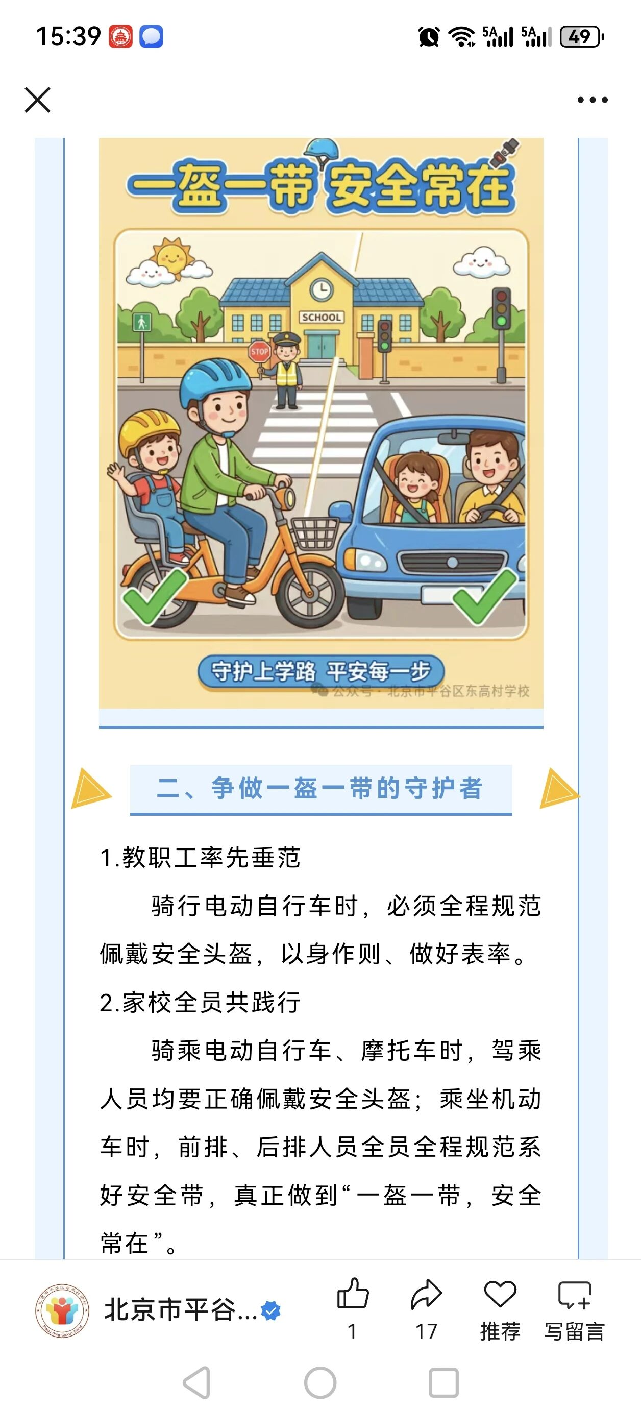 升旗仪式、校园广播及学校微信公众号等平台,面向全体师生及家长发出“一盔一带”安全倡议,广泛凝聚安全出行思想共识。引导师生家长将交通规则内化于心、外化于行,让安全文明出行的理念在校园内外落地生根。