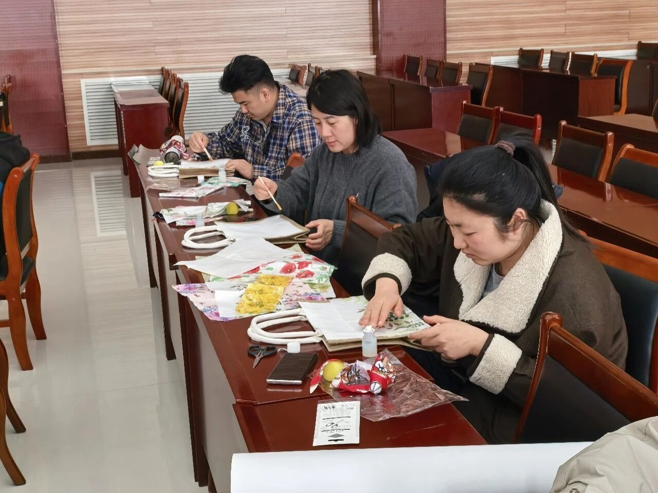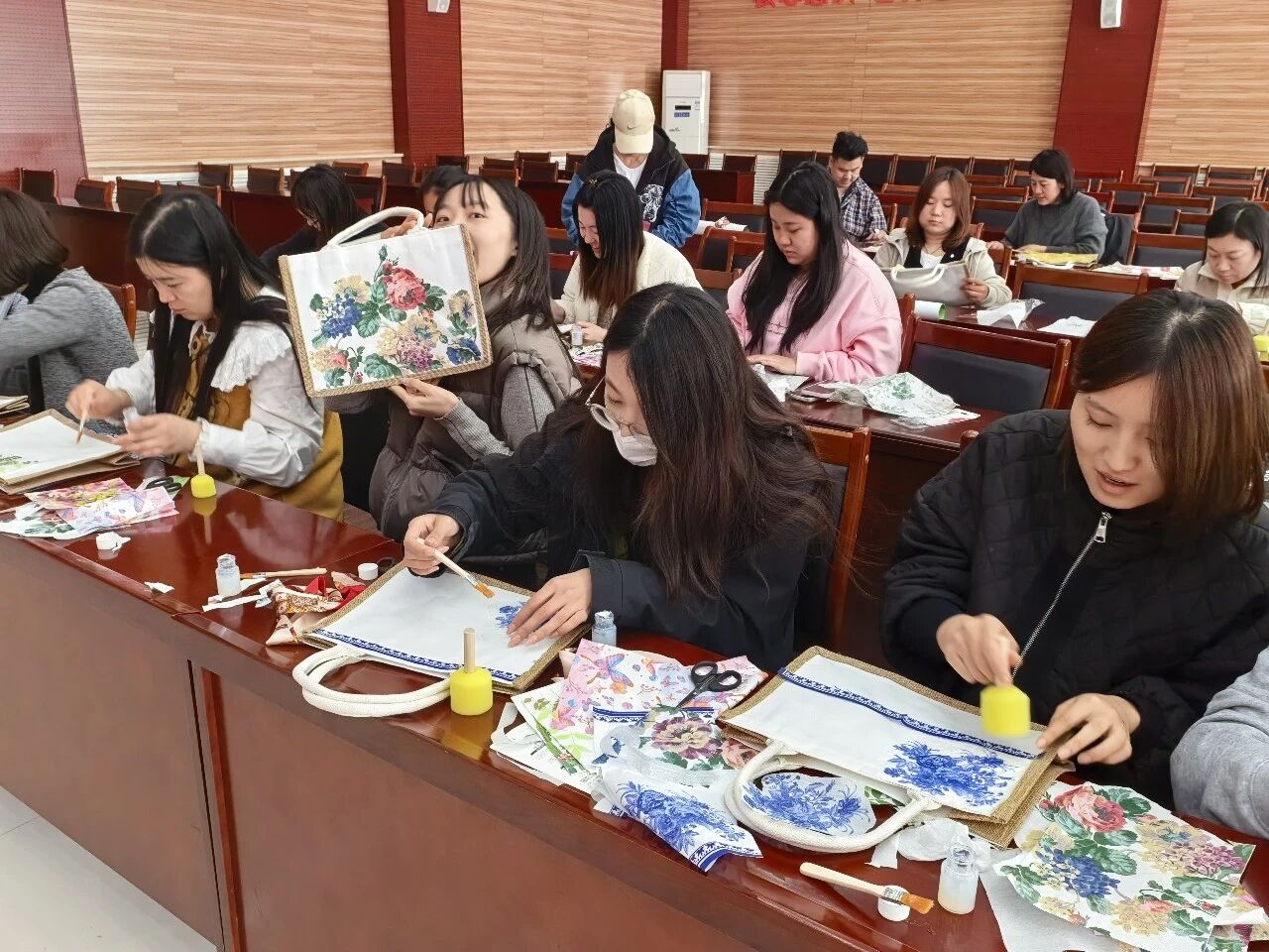创意手绘环节邀请专业老师现场授课,细致讲解绘画技法、色彩搭配等内容。村民们充分释放想象力与创造力,结合自身感受,将简约的托特包绘制成兼具个性与美感的独特作品,系上丝巾装扮生活。现场氛围轻松热烈,欢声笑语不断。