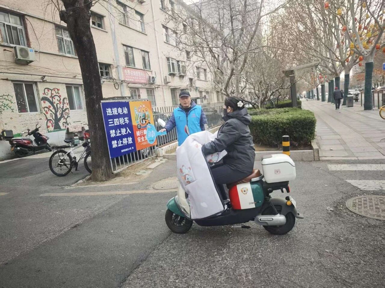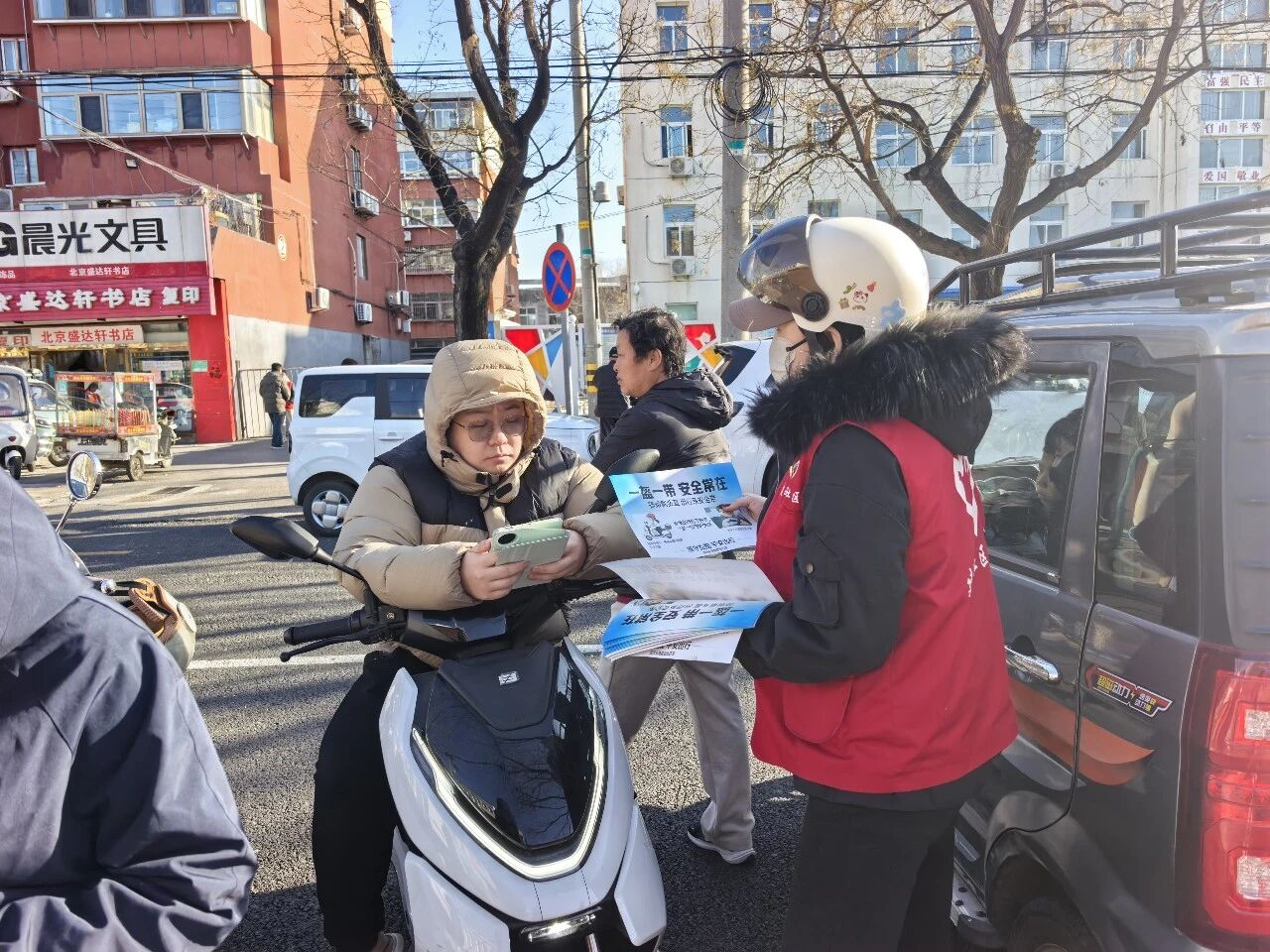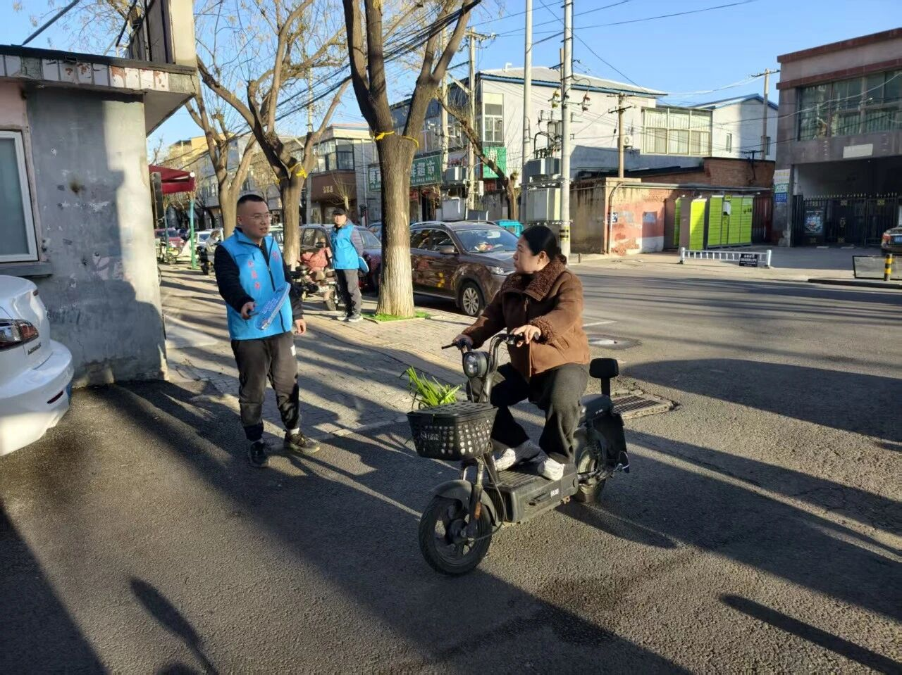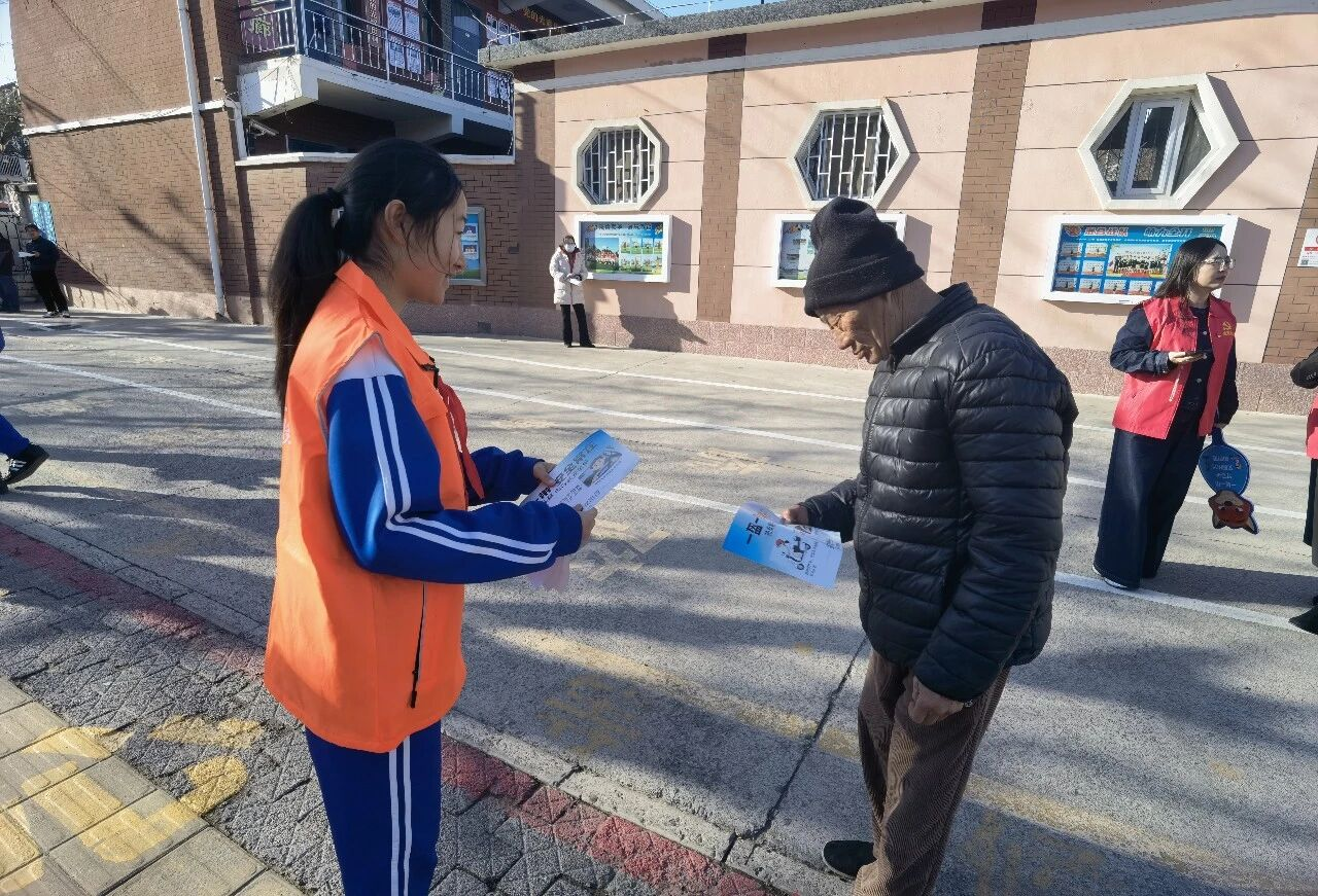 每日出行高峰期,志愿者身着统一服装,在路口与小区出口定点值守,面向过往居民开展文明交通、文明养犬宣传,针对电动车出行、犬只管理等热点问题,用通俗语言普及安全注意事项,提醒居民骑行佩戴安全头盔、遛犬牵绳并及时清理粪便。