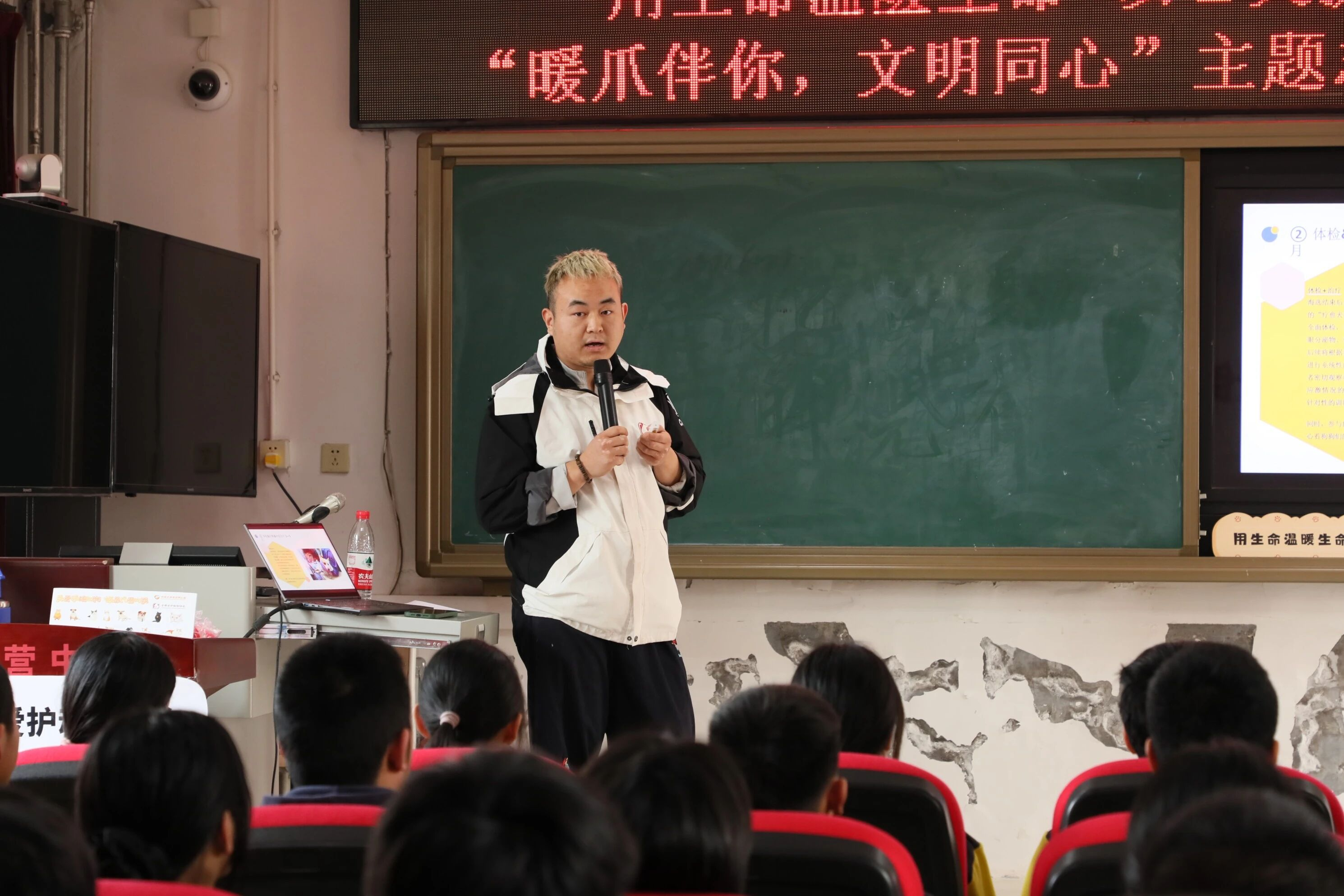 在“行为纠错”抢答环节,同学们观看日常与犬只互动的视频片段,快速指出其中的错误行为,答对者获得小礼物。现场气氛热烈,同学们在互动中加深了对动物习性的了解与对生命的敬畏。