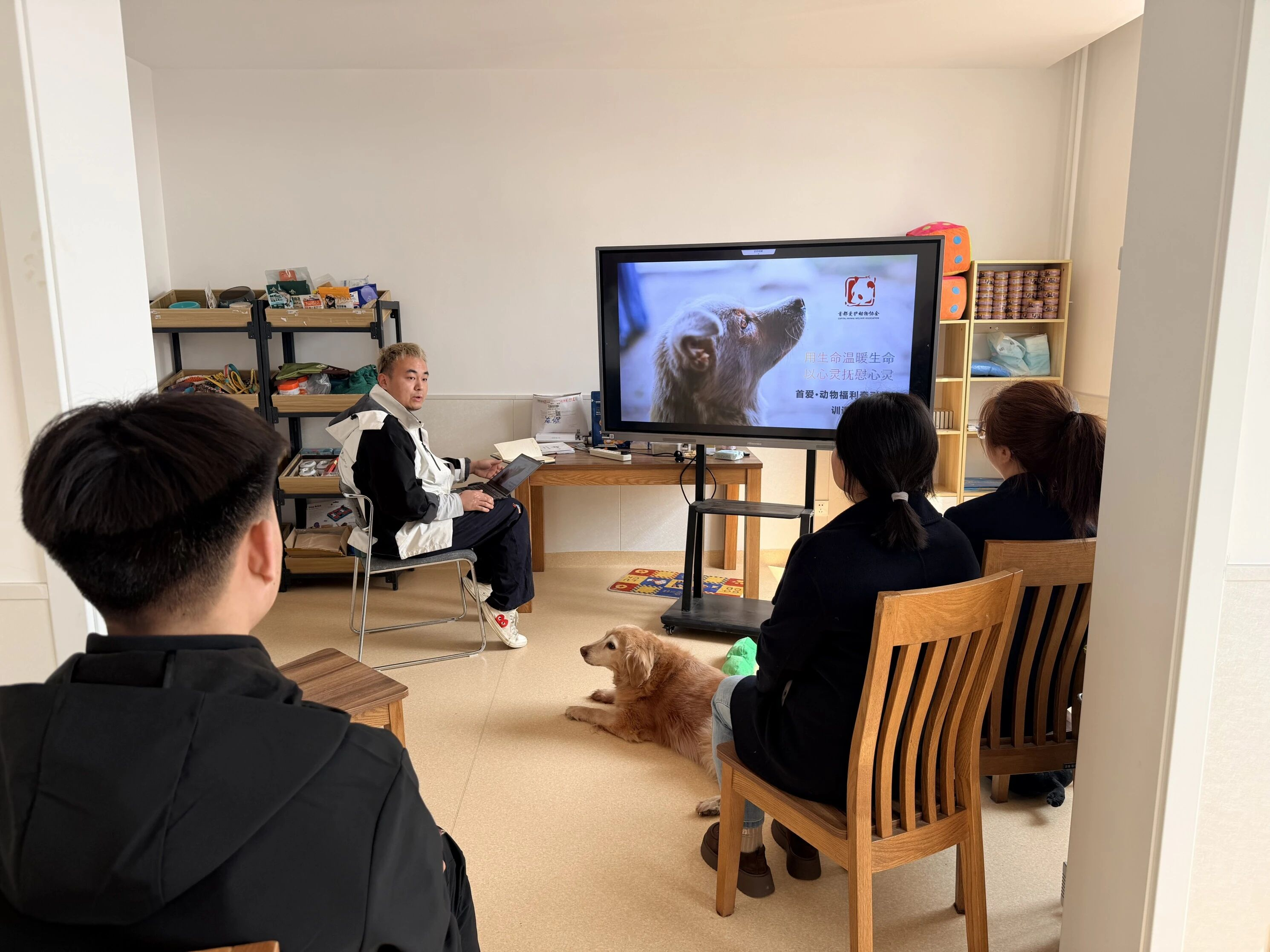 活动伊始,首都爱护动物协会的专业讲师向在场师生介绍了本次活动的主题、疗愈犬的特殊使命以及专业的团队构成,同时强调了互动过程中的安全事项与礼仪规范,迅速拉近了与同学们的距离,为后续环节奠定了轻松融洽的基调。随后,带来了干货满满的文明养宠知识小课堂。讲师围绕依法登记、出门牵绳、清理粪便、犬只行为解读等核心内容,结合生动的情景模拟和趣味问答,深入浅出地传递了“尊重生命、责任养宠”的现代文明理念。
