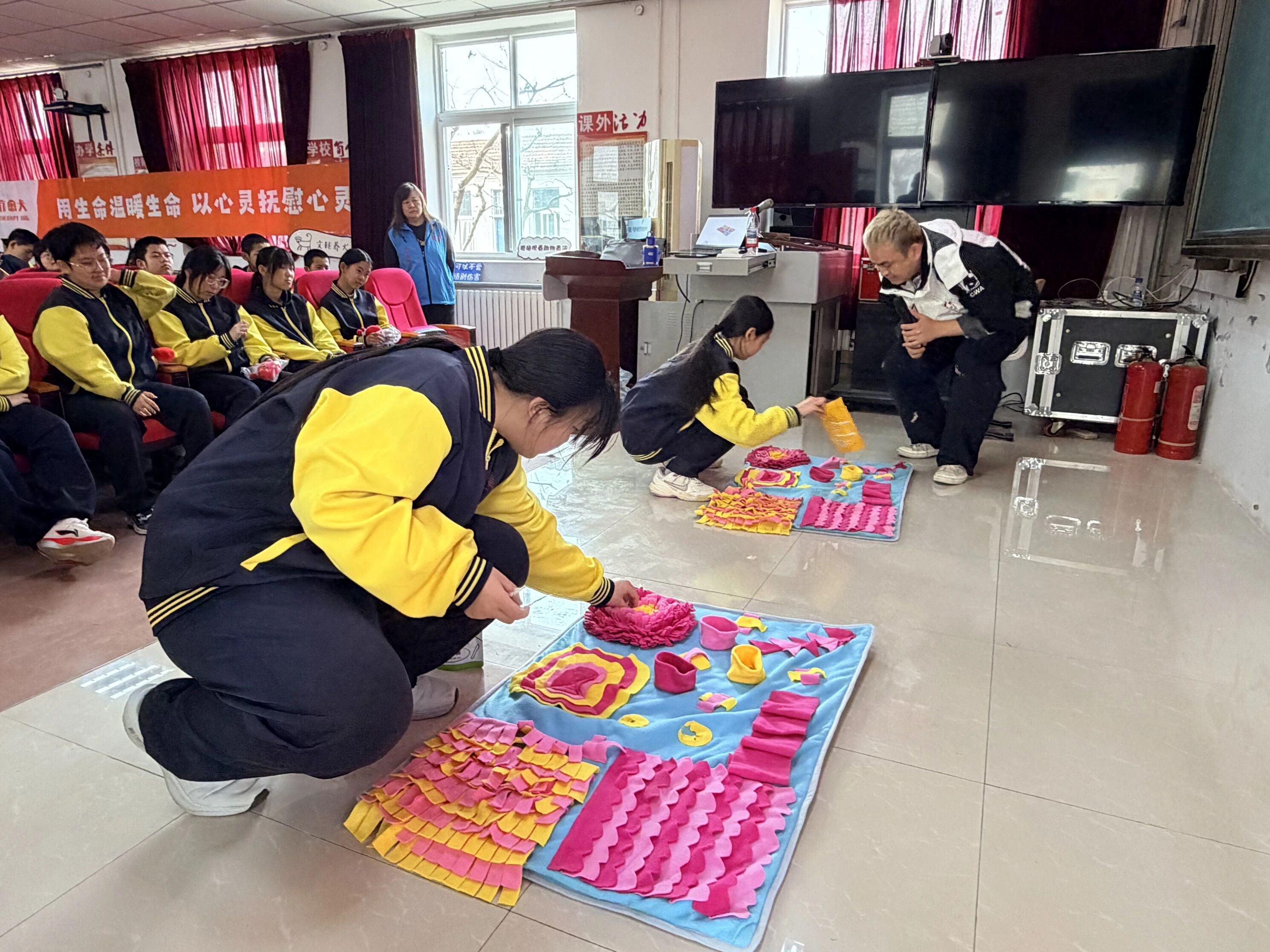 在备受期待的人宠互动环节,经过专业培训的青年志愿者在督导下,引导同学们分组与温和的疗愈犬进行近距离接触。这并非简单的玩耍,而是一场融入心理陪伴元素的体验。志愿者引导同学们依次为疗愈犬测体温、听心跳,在安静触碰中感受生命温度;随后进行的“猜猜食物在哪只手”小游戏中,疗愈犬通过嗅闻判断食物位置,猜对后志愿者打开手掌奖励,现场掌声不断;最后,在专业老师引导下,同学们将冻干狗粮藏在藏食垫中,让疗愈犬通过嗅闻“寻宝”,人与犬的默契与信任悄然生长。通过简单任务,同学们直观地感受到了人与动物之间纯粹而温暖的情感联结,现场充满了治愈的气息。