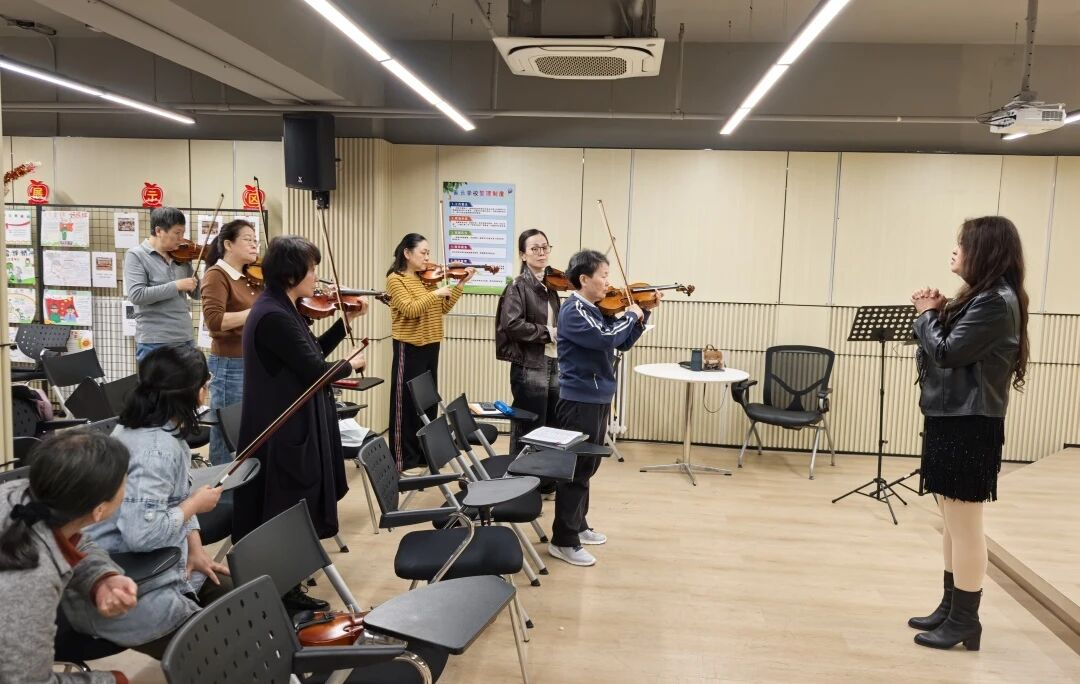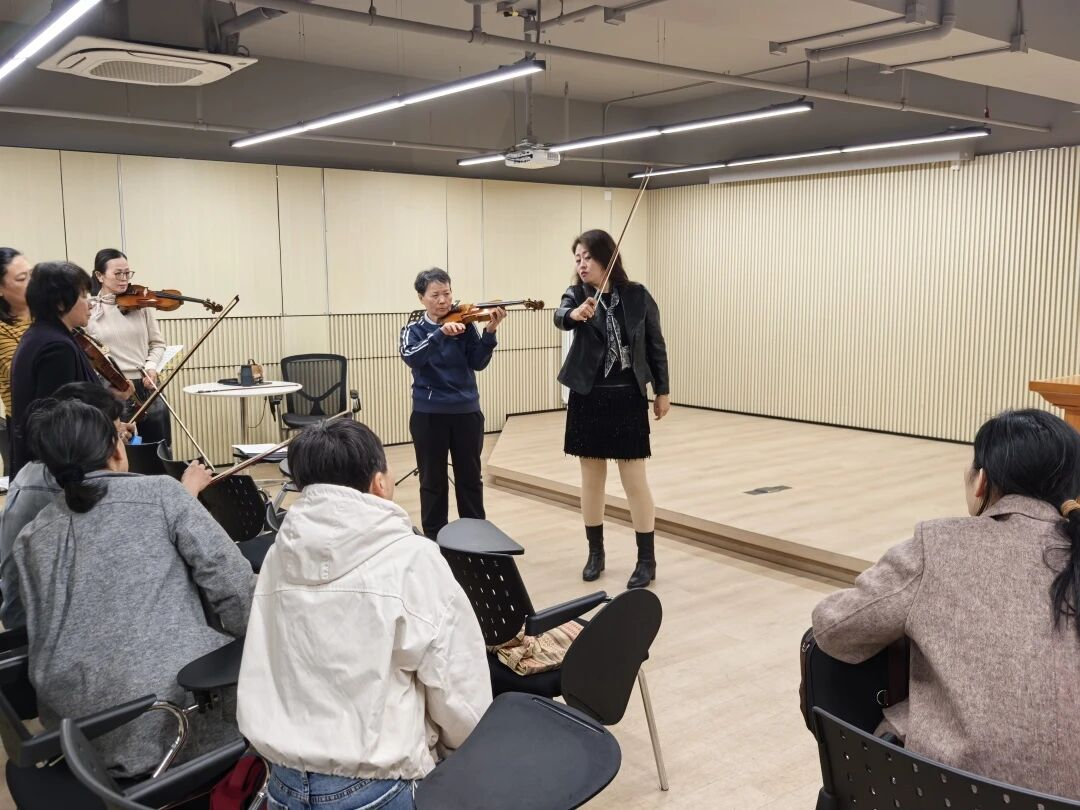 课堂上,老师根据学员基础分层次教学。针对初级学员,老师从最基础的持琴、握弓姿势教起,悉心指导拉弦的基本方法,并通过三角形、正方形、直角三角形三种图形辅助练习,帮助学员直观理解运弓轨迹与节奏变化,在轻松有趣的氛围中打好基本功。