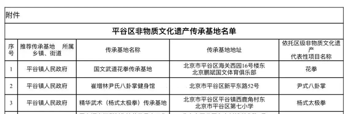 近日,平谷区文化和旅游局公示了平谷区非物质文化遗产传承基地认定名单,平谷镇申报的国文武道花拳传承基地、崔增林尹氏八卦掌健身馆、精华武术(杨式太极拳)传承基地全部顺利通过评审,成功入选区级非物质文化遗产传承基地名录。