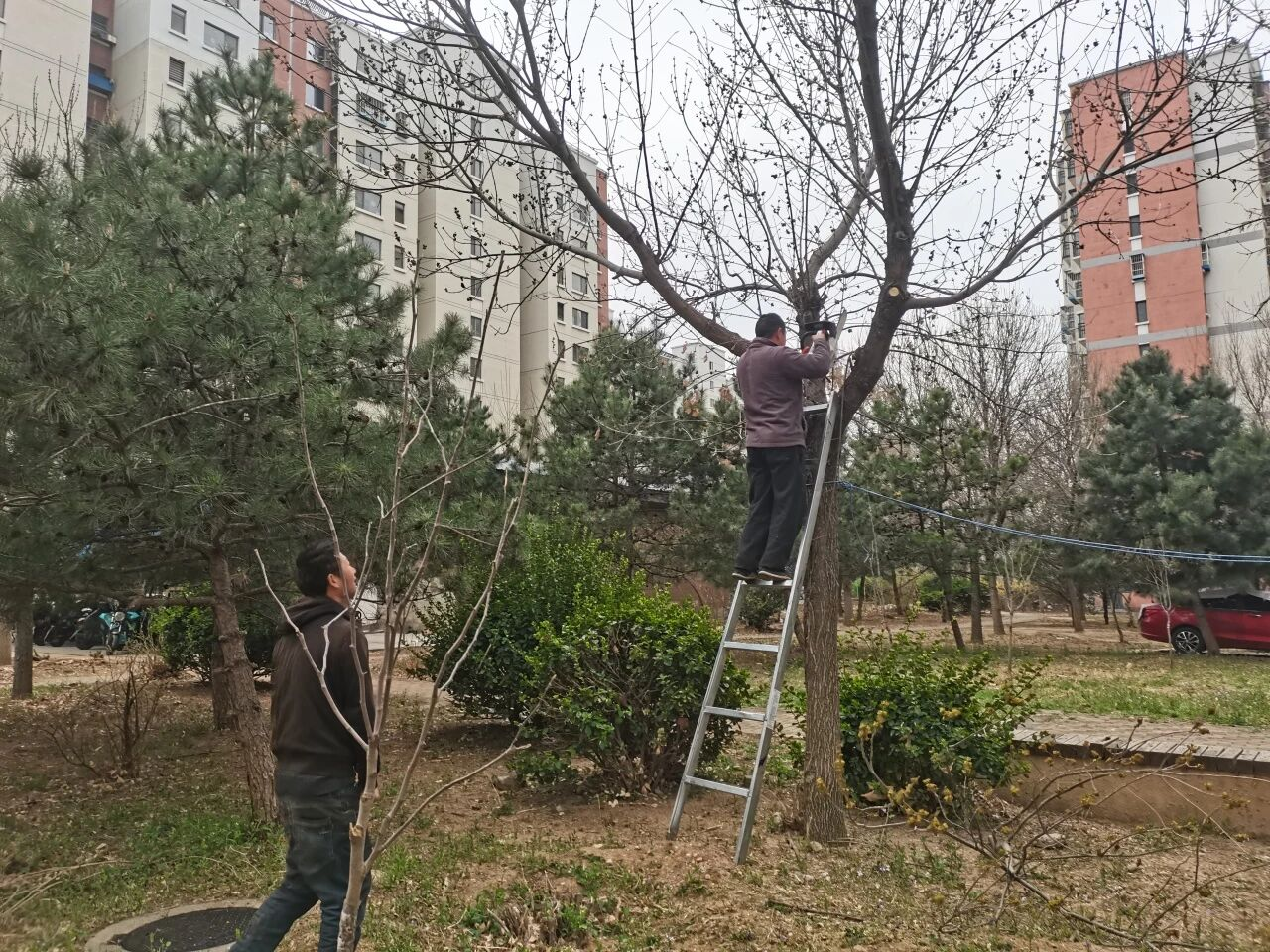 针对上述问题,社区聘请资质齐全、经验丰富的专业团队进行修剪。施工过程中,工作人员严格遵循科学修剪原则,精准处理过密枝、枯枝和徒长枝,同时做好现场安全防护,切实保障居民财产和人身安全。