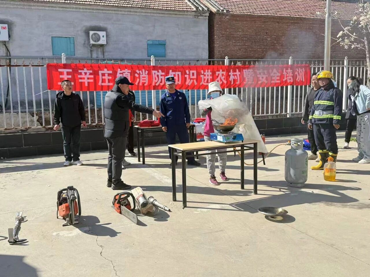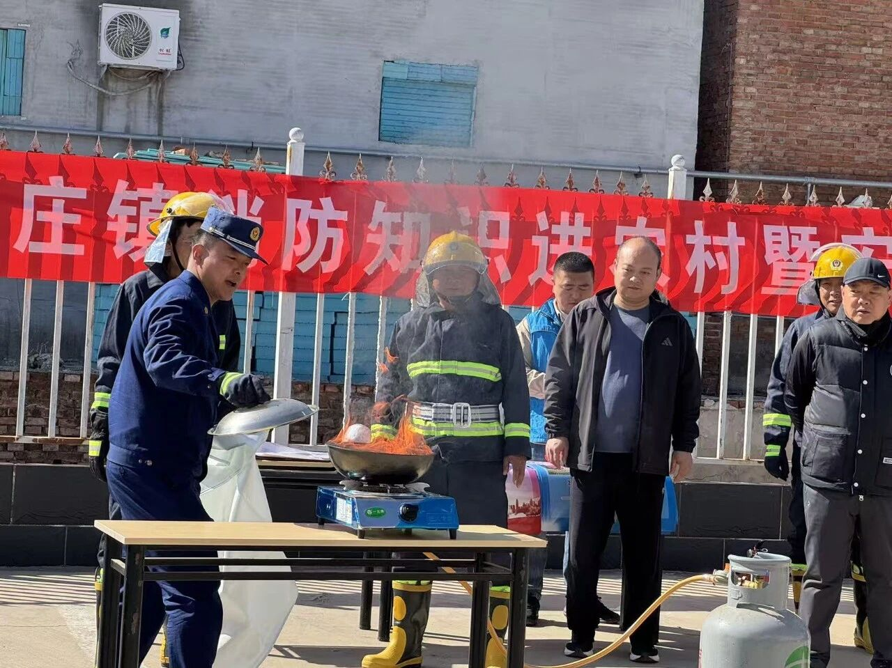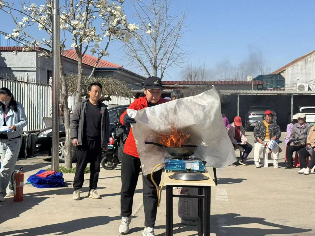 实操演示:消防队员现场模拟油锅起火场景,演示盖锅盖、使用灭火毯等操作,并邀请村民亲手操作体验,纠正操作姿势和细节问题。确保大家“懂原理、会操作、能应急”。
