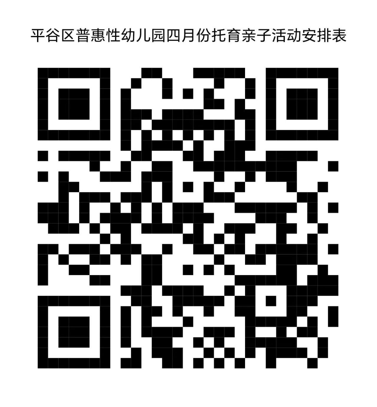 四月托育亲子活动报名已全面开启,感兴趣的家长可扫描下方二维码,查看《平谷区普惠性幼儿园四月托育活动安排表》,自主选择就近园所咨询报名。