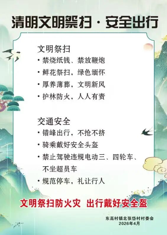 近日,北张岱村开展“文明祭扫护平安 安全出行暖民心”主题宣传活动。抓实护林防火、交通安全管控,全力守护村民生命财产安全,积极引领文明祭祀新风尚。
