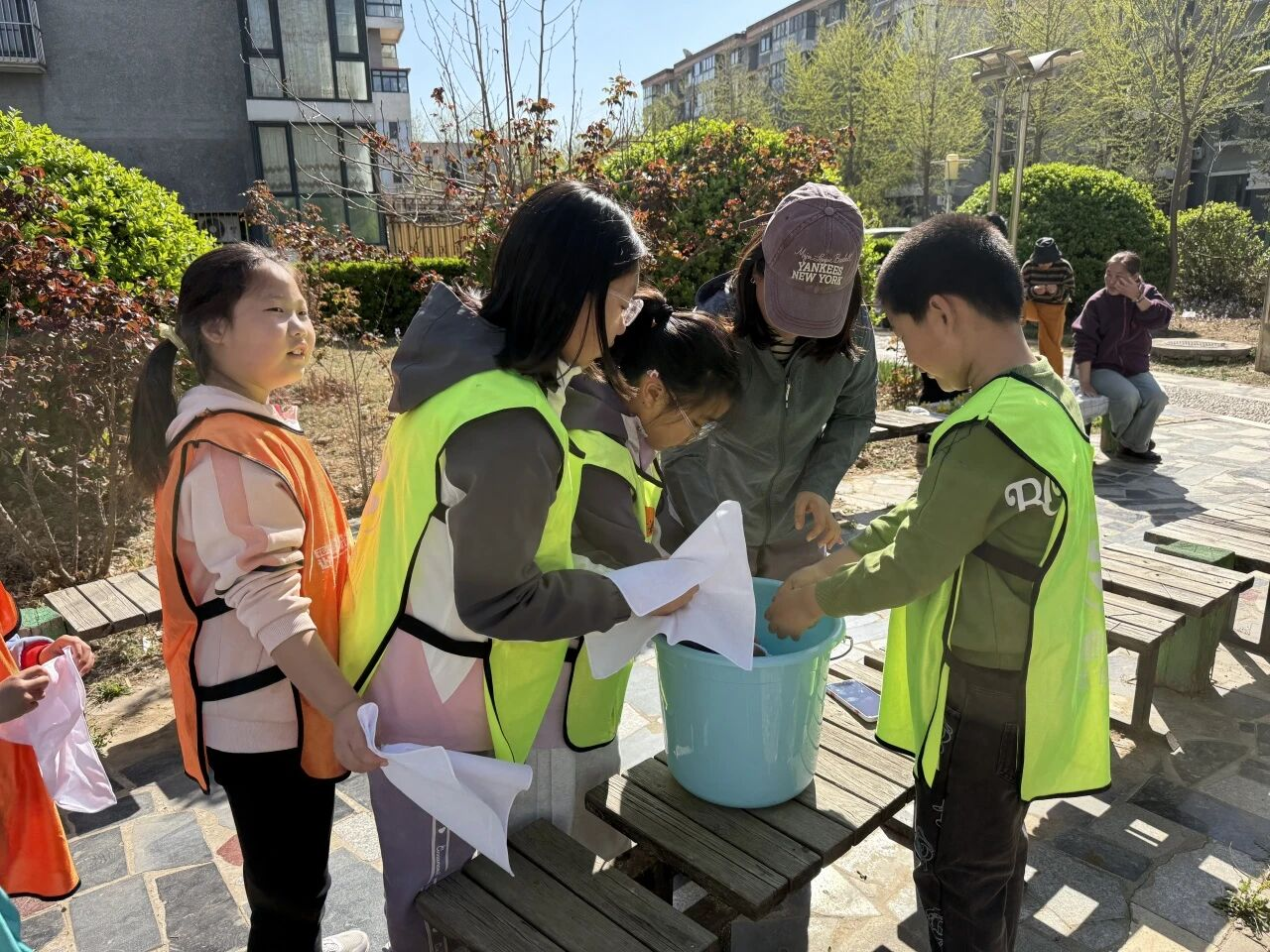 活动中,坚果老师用生动易懂的语言,为孩子们讲解扎染的历史渊源、文化内涵与基础制作技巧。从布料折叠、捆扎固定,到染料调配、浸染上色,孩子们认真聆听、积极互动,现场氛围轻松而热烈。